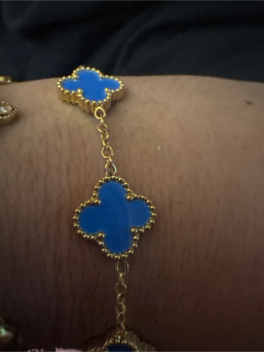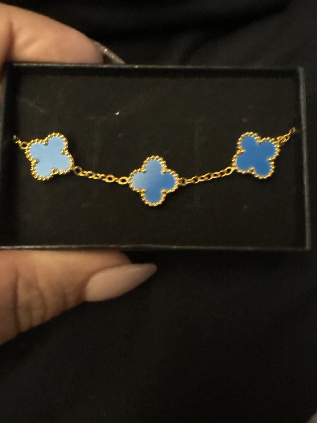 Selling a beautiful clover K18 bracelet with blue clover motifs and a gold chain. It comes with its original box! The bracelet is New and ready to add a touch of elegance to your style comes with cleaning cloth
