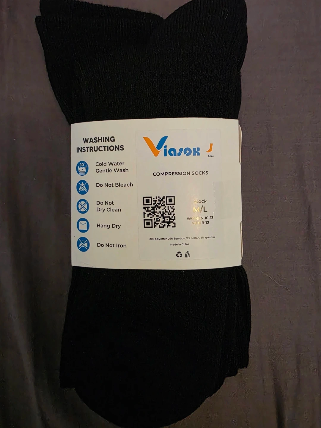 I have a pair of Viasox knee compression socks for sale! They are black and size M/L, fitting women's sizes 9-12 and men's sizes 10-13. The socks are made of 66% polyester, 26% bamboo, 5% cotton, and 3% spandex