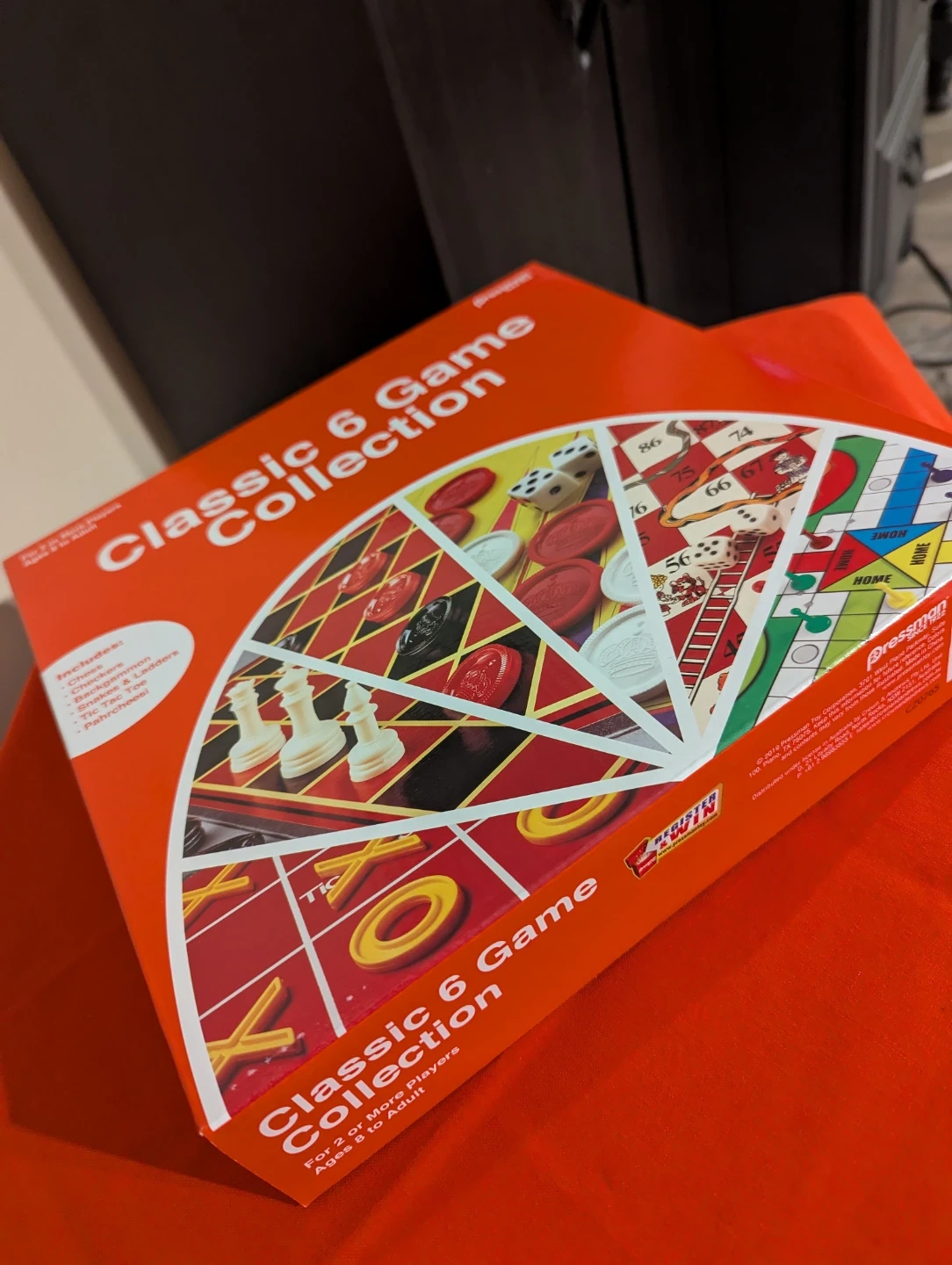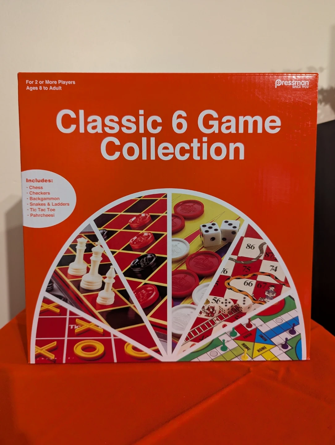 152Selling a brand new Classic 6 Game Collection! It's still in its original packaging and ready for some family fun. This set includes Chess, Checkers, Backgammon, Snakes & Ladders, Tic Tac Toe, and Parcheesi. Perfect for ages 8 to adult! Pickup only