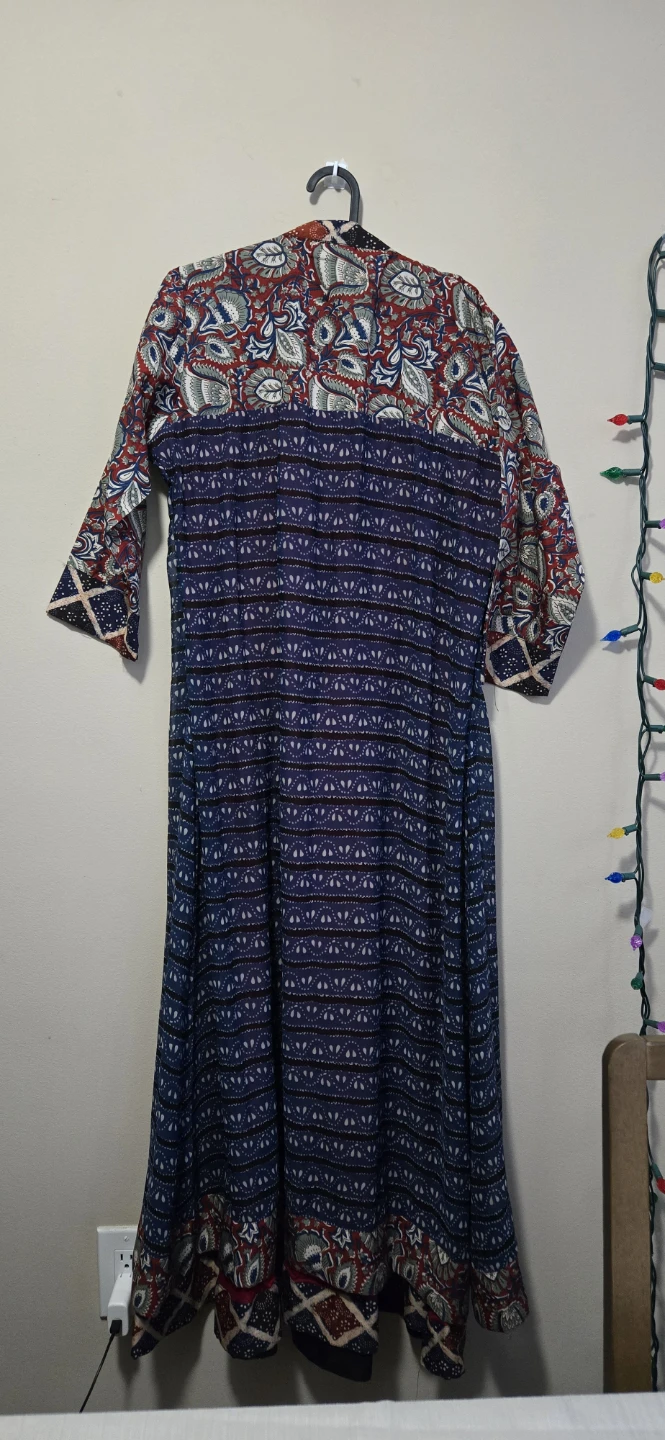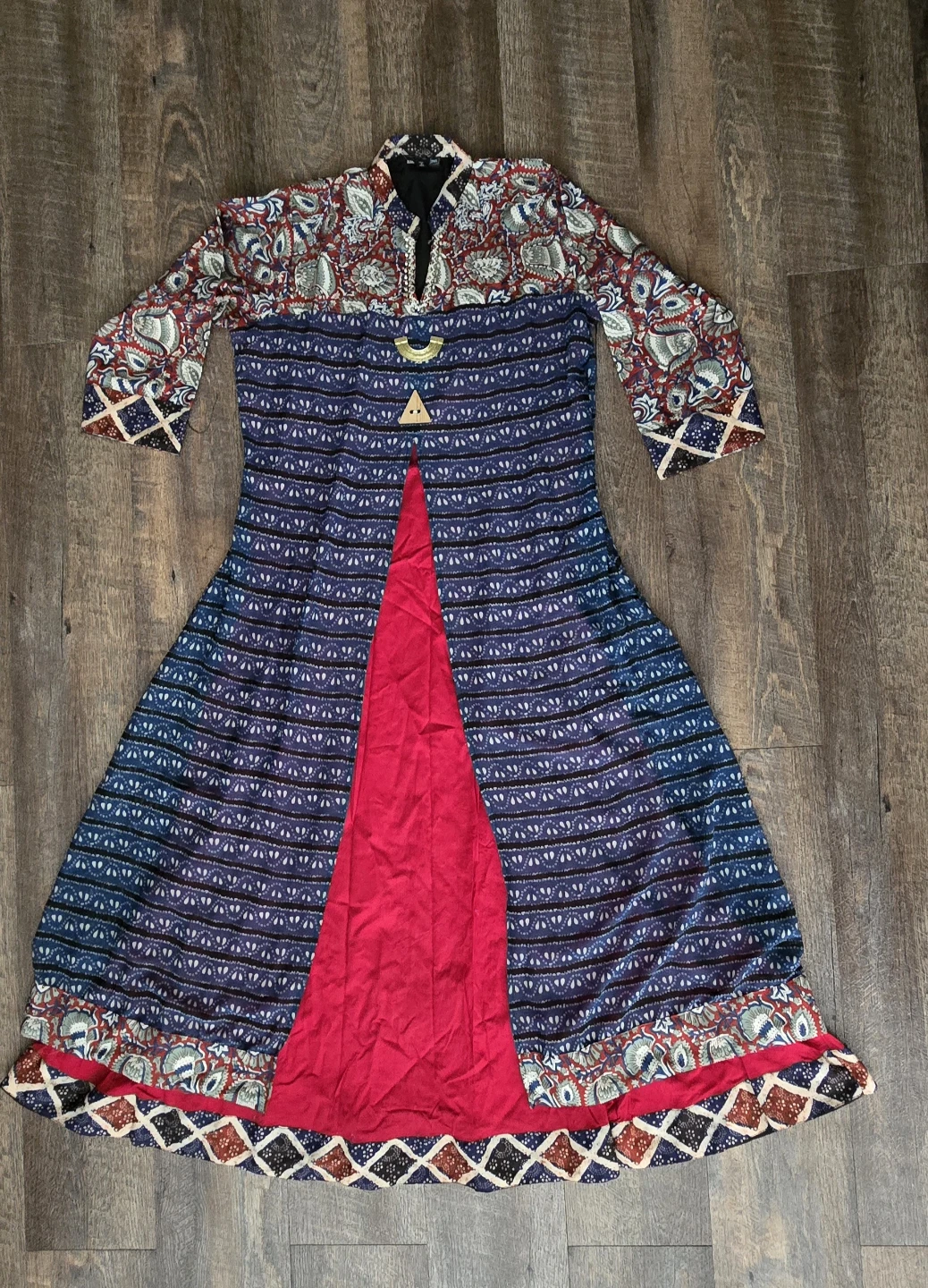 A unique dress with a colourful pattern! It has a red panel in the front and a high collar. Perfect for a special occasion or to add some flair to your everyday style