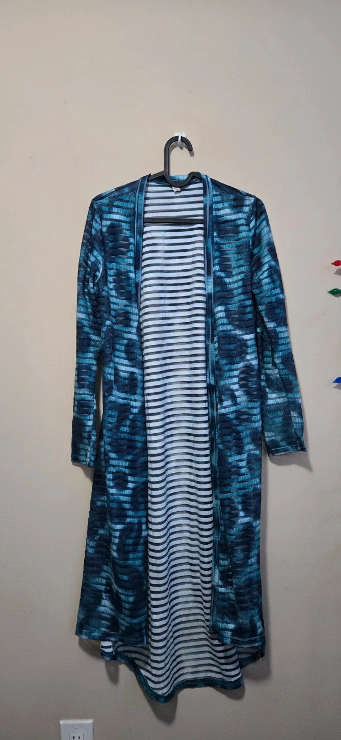 Here's a lovely cardigan featuring a unique blue pattern! It's in great condition and ready for a new home