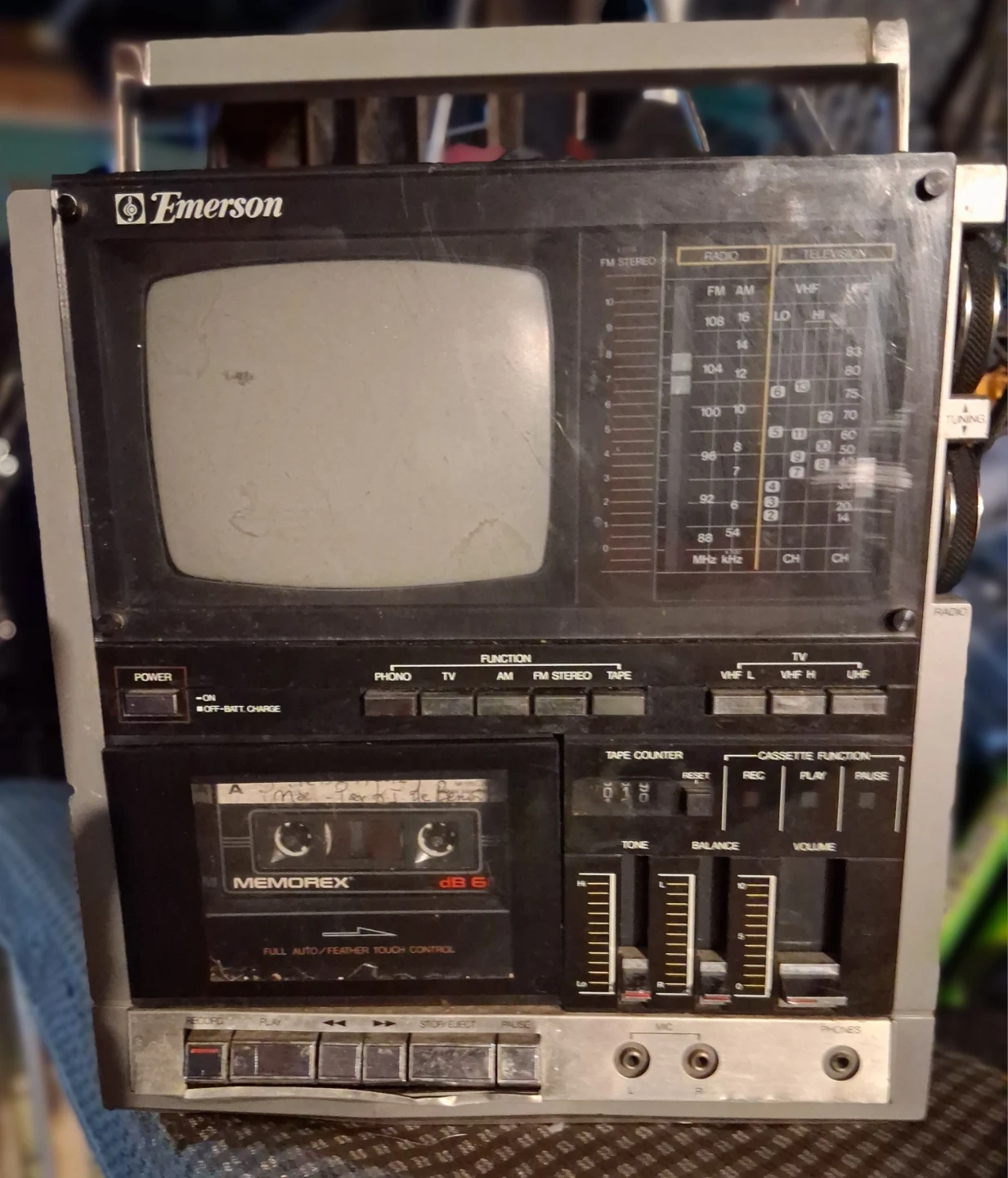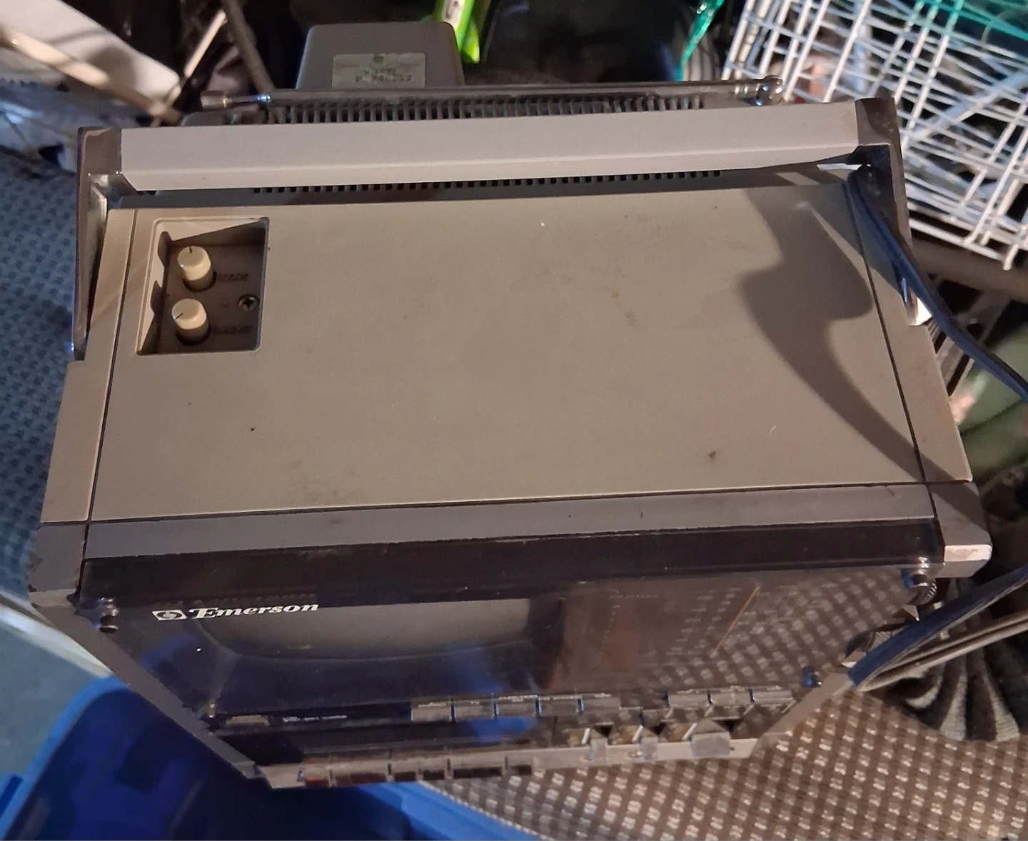 Selling a working vintage Emerson TV radio cassette player combo. It's a cool retro piece that combines a small TV, radio, and cassette player in one unit. Great for collectors or anyone who loves vintage electronics!