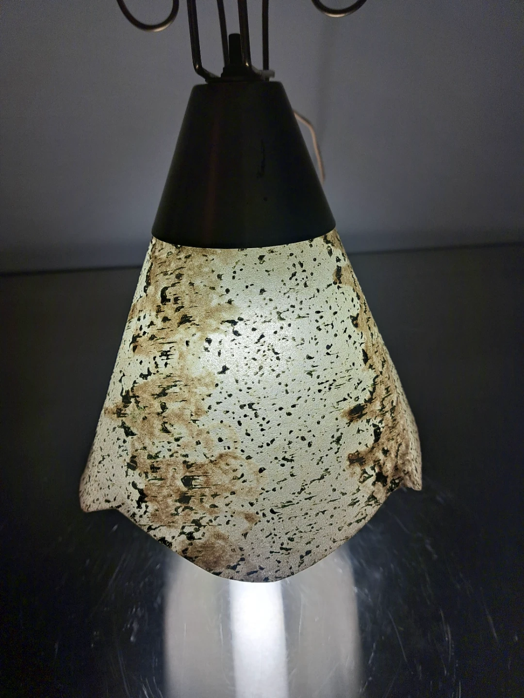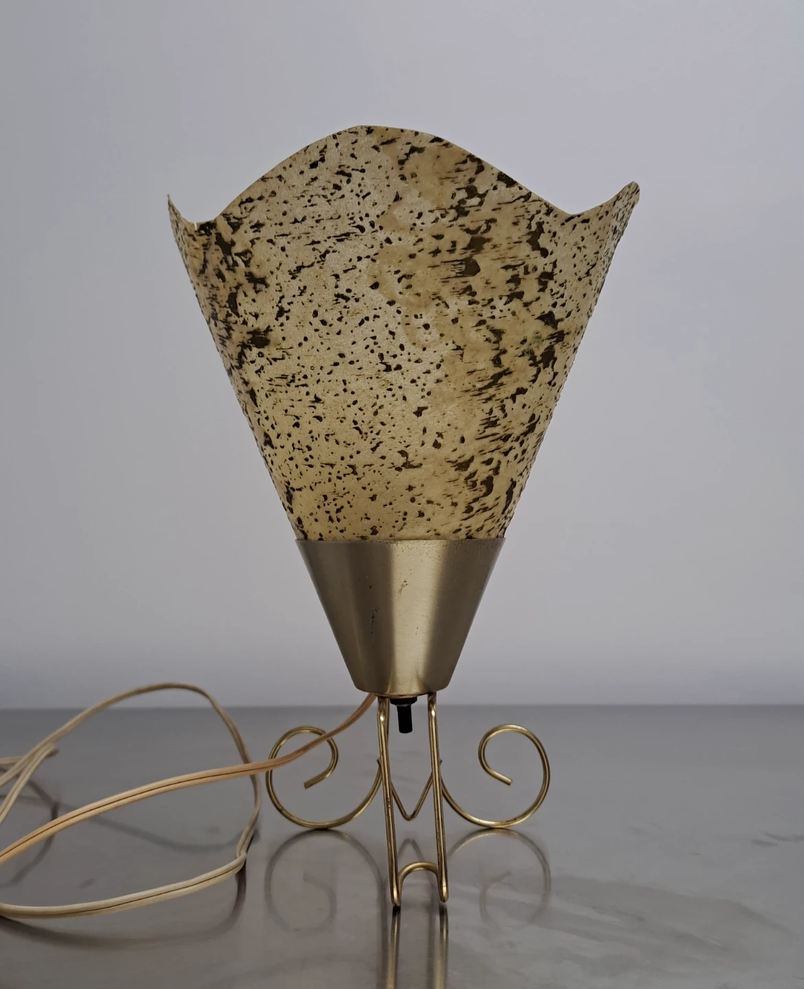 Here's a stylish MCM accent lamp or wall sconce with a unique vintage vibe! It features a cone-shaped fiberglass shade with a mottled pattern, complemented by a brass-coloured base with decorative swirls. It's perfect for adding a touch of retro charm to any room