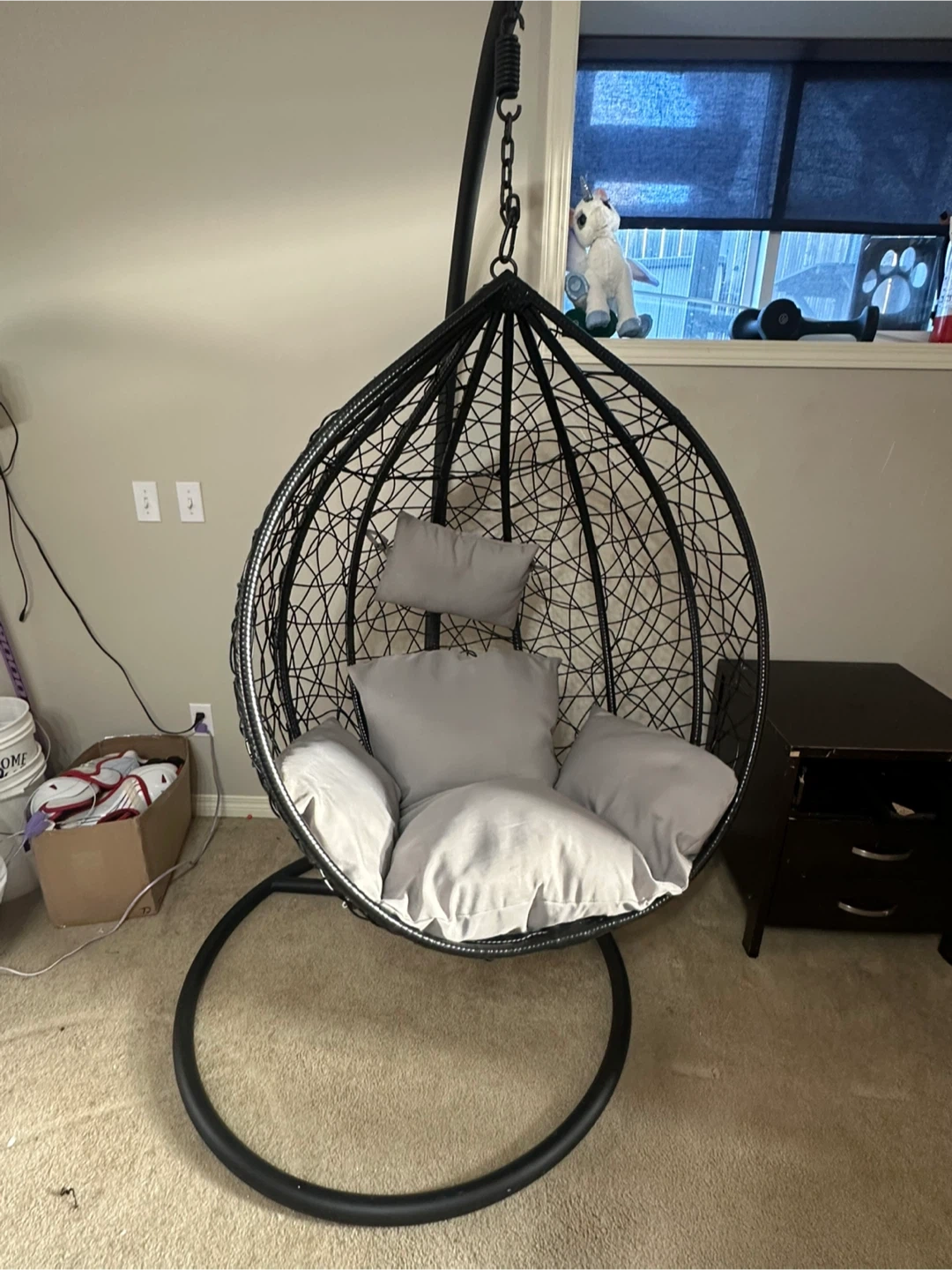 Selling a comfy hanging egg chair with a black frame and soft cushions! Very sturdy. Always used indoors.