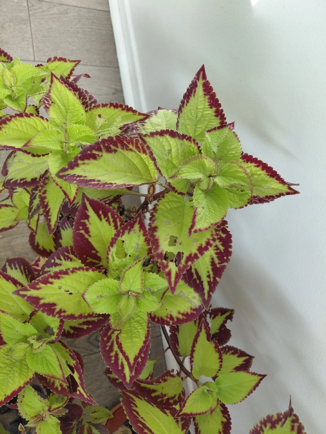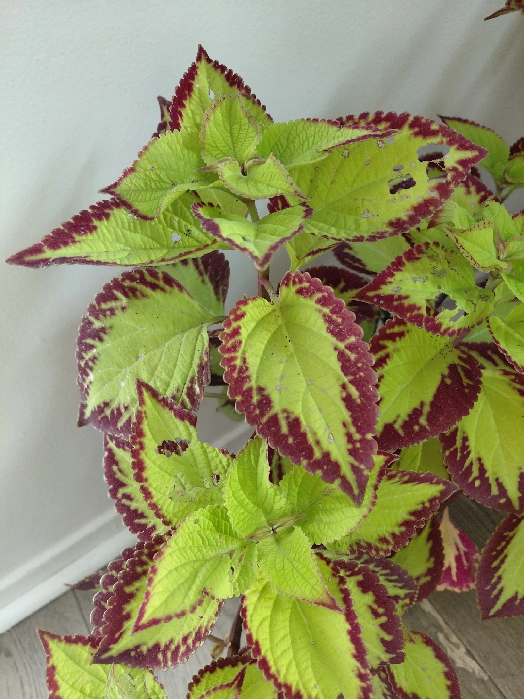 Iβm selling one of my larger coleus plants. Some of the older leaves have holes from ants and other pests while it was outdoors during the summer. However, healthier leaves have been growing since we brought it inside last month.