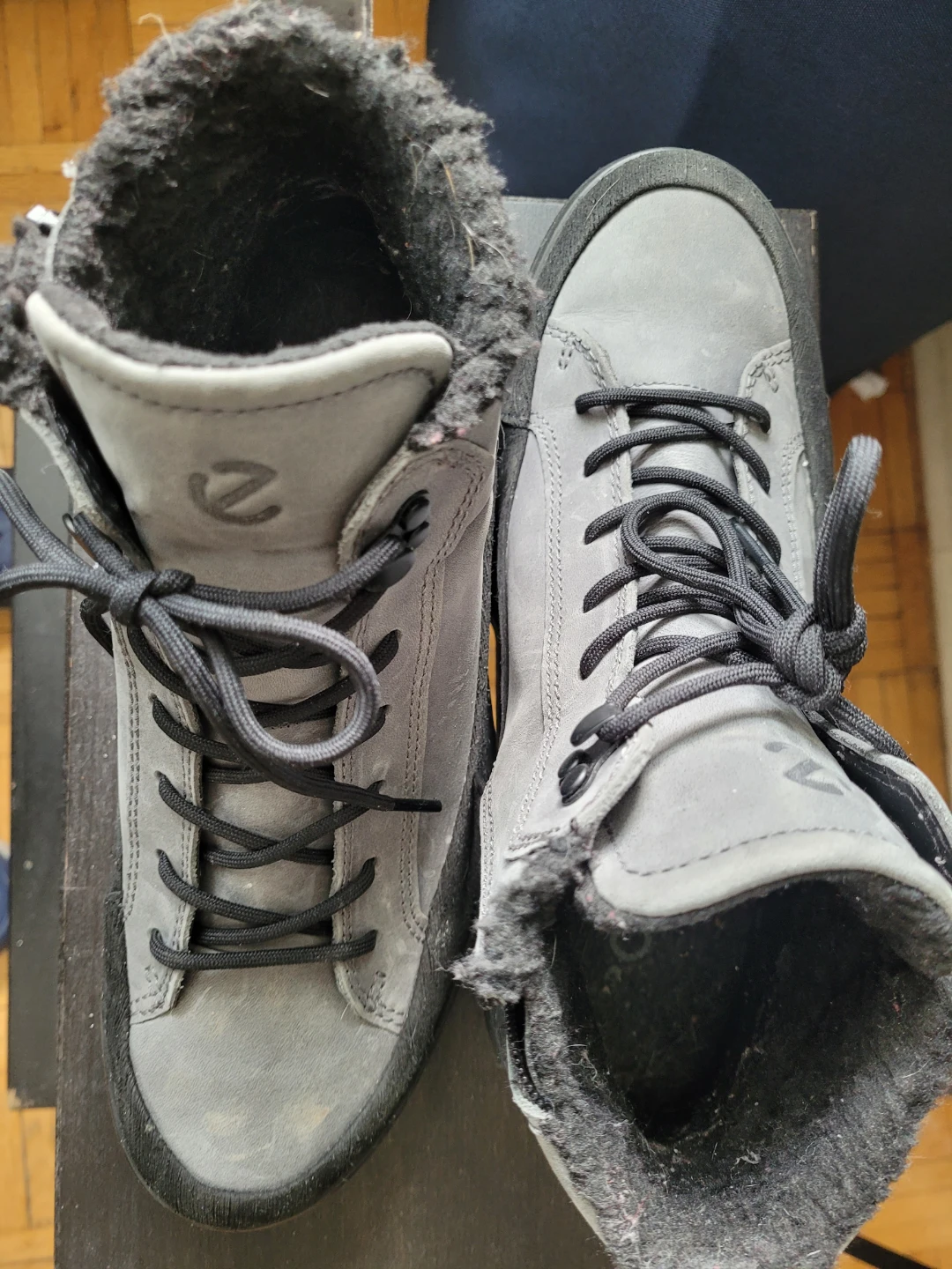 Selling a pair of Ecco boots in a stylish grey colour! They are made of leather and are a size 6.5-7 US (40 EU). They feature a zipper on the side and a lace-up front.