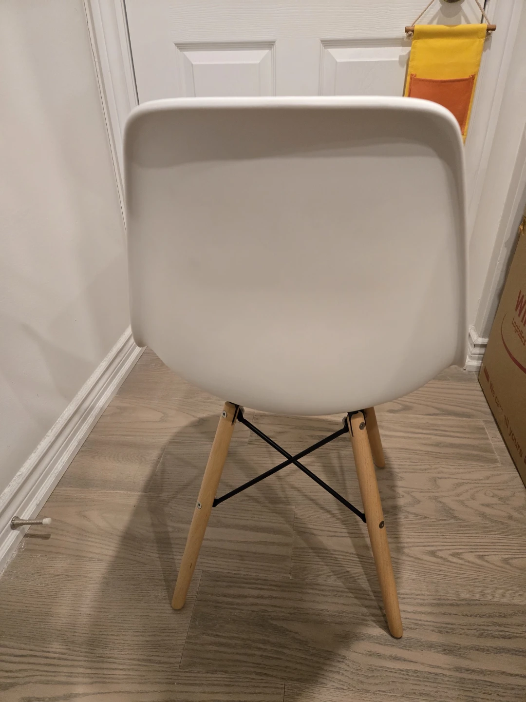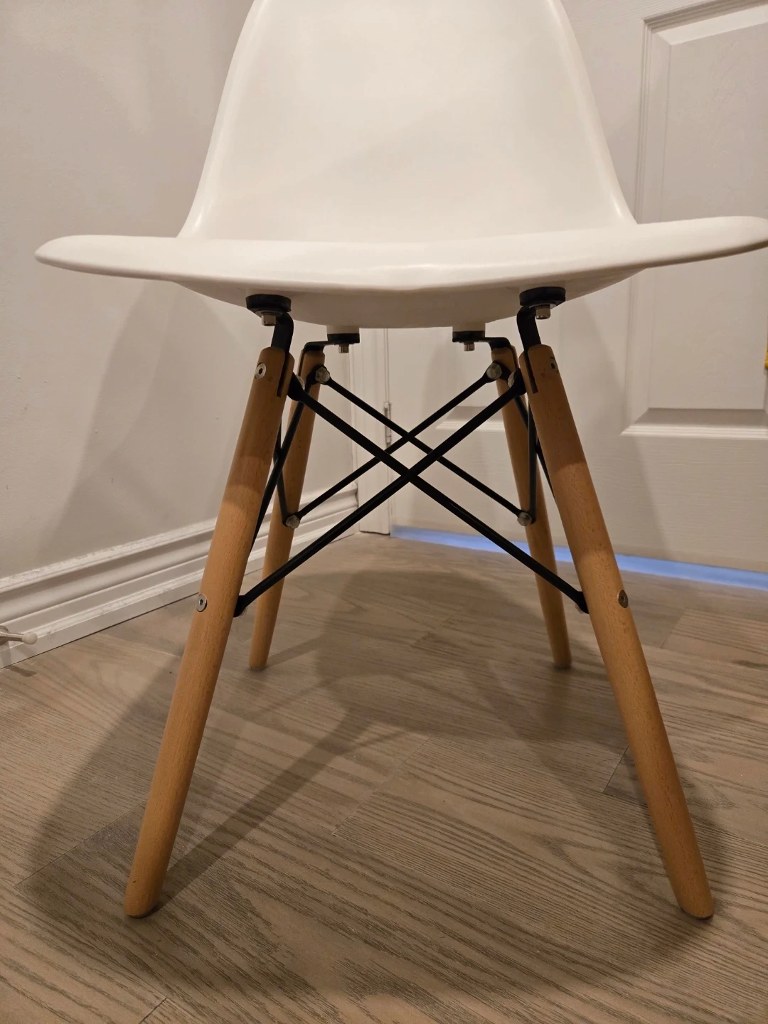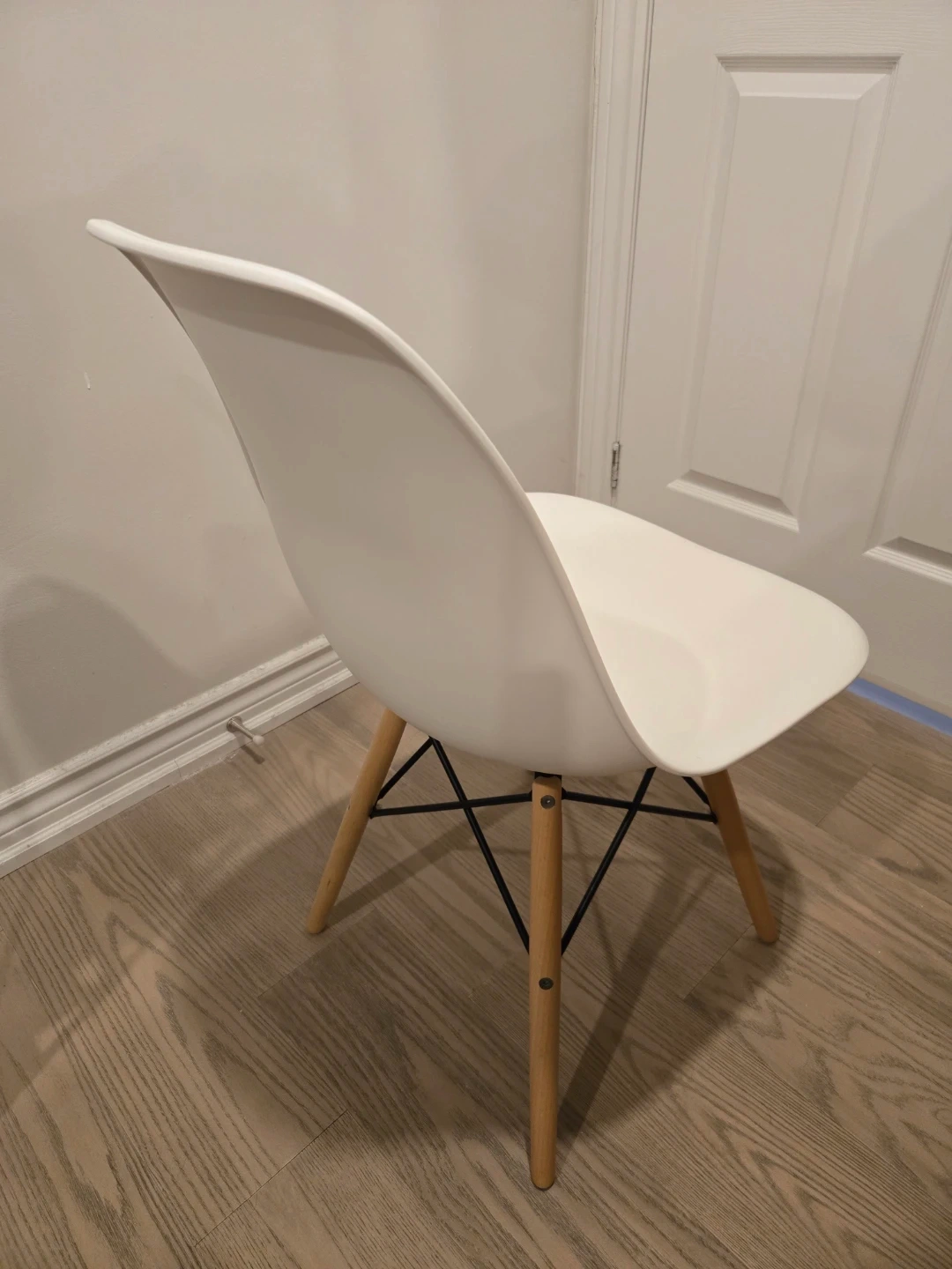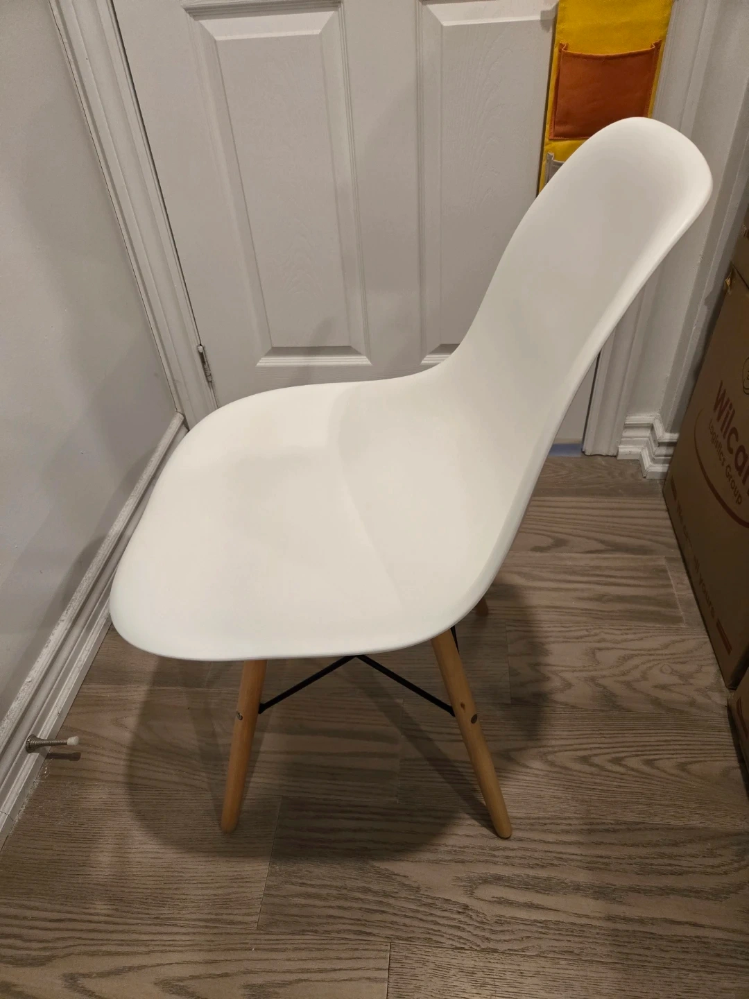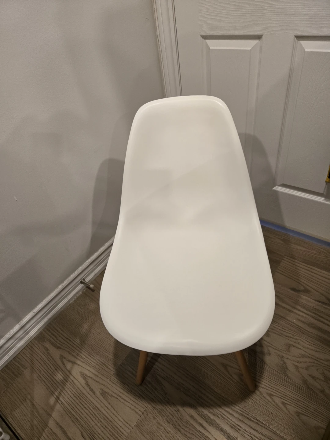 Selling a white plastic dining chair with wooden legs. It's in great shape and would look lovely in any dining room or kitchen!