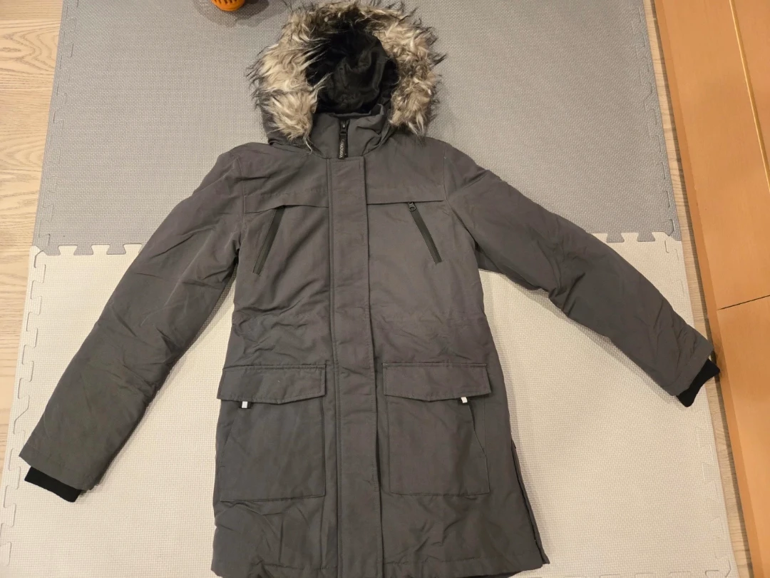 Stay warm this winter with this Canadiana parka! It's a size small and in great condition. The outer shell is made of 100% recycled polyester, and the lining is 100% polyester as well. It also features a cozy hood with faux fur trim to keep you extra snug.