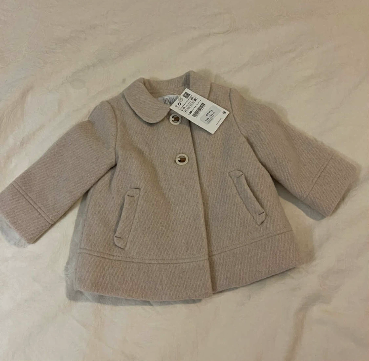 A cute Zara baby girl coat, perfect for keeping your little one warm! NWT and sized for 9-12 months. The tag shows the original price was $65.90. The coat is made of 70% lana wool, 25% polyamide, and 5% other fibres