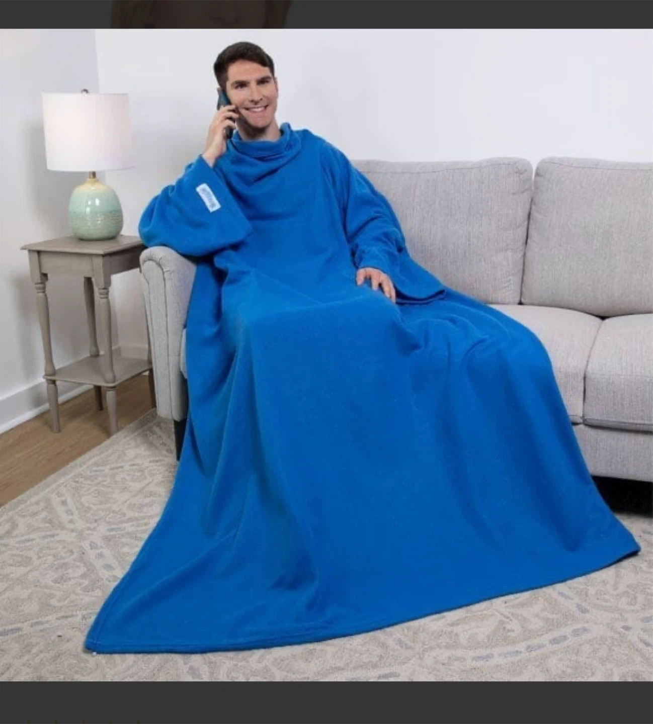 Stay cozy with this True Blue Snuggie! It's a super soft fleece blanket with sleeves, perfect for keeping your hands free while you relax in total comfort. Complete freedom of movement!