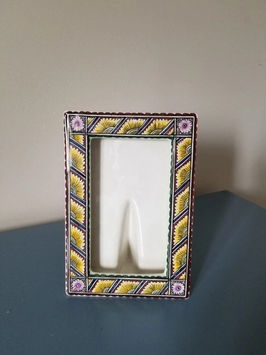 Designed to accommodate a 5.25 x 3 inch photograph, this portrait-oriented frame is suitable for displaying your cherished memories. The free-standing mounting style ensures easy access to your photo, which is protected in a space that's both functional and elegant. This original piece, handcrafted, hand-painted and signed, brings a touch of Portuguese craftsmanship to your home. The frame stands 7 inches tall and 5 inches wide, with a 5.25 x 3 inch area for the photo.