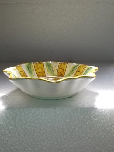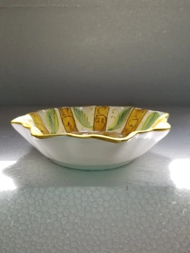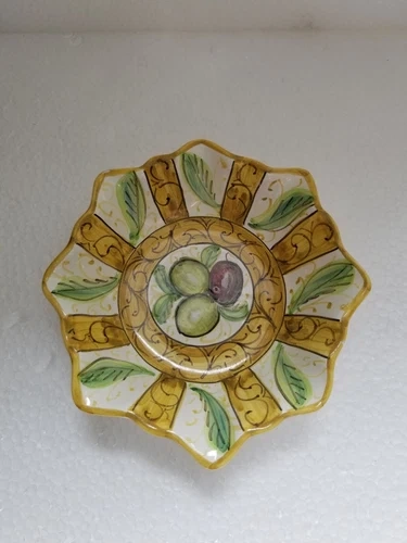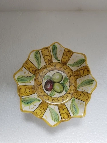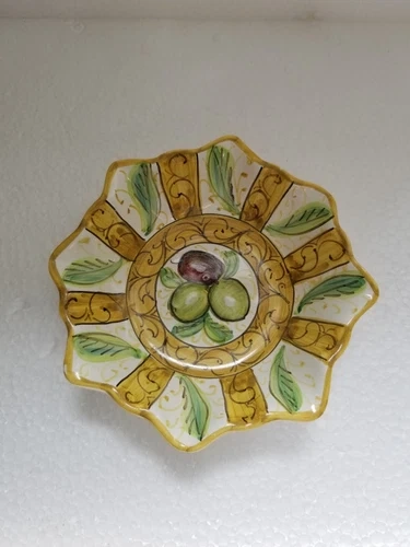 Lovely Italian Artesia Ceramica (Certaldo) Dip A Mano trinket/dipping dish. Handcrafted and handpainted in green, gold and purple in an Olive leaf design. Could be used as a dipping bowl or trinket bowl. A little bit of Italy. 5.5 inches wide x 1.5 inches high.