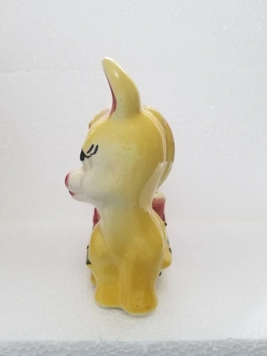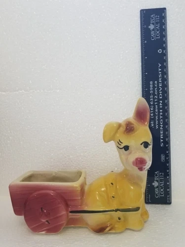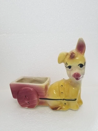 Embrace the charm of yesteryear with this Vintage American Bisque Donkey Mule Burro Cart Planter Vase. Lovely bright yellow and pink. Classic American style. With its unique donkey shape and design, it brings a touch of whimsy to any space. Dating back to the 1950s and originating from the United States, this original planter reflects the quality and artistry of its era. A lovely piece of vintage decor. 8 inches long x 3 inches wide x 6.5 inches high.