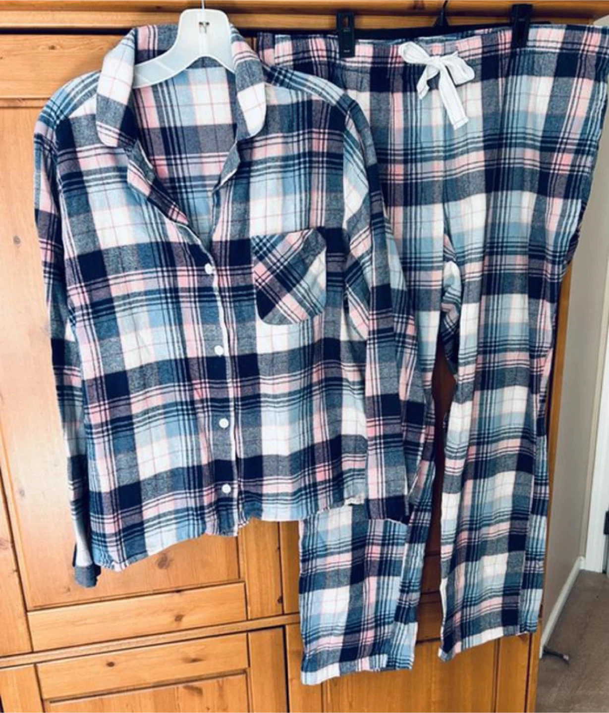 Cozy up with this comfy flannel pajama set! The set features a classic plaid pattern in shades of blue, pink, and white. Perfect for those chilly nights!