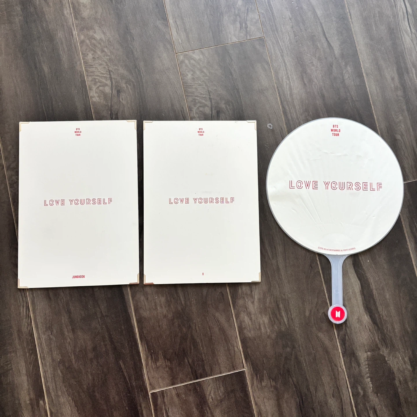 Selling some BTS World Tour 'Love Yourself' merchandise! Includes a Jungkook photobook and a V photobook, plus a fan with V's picture on it. All in good condition