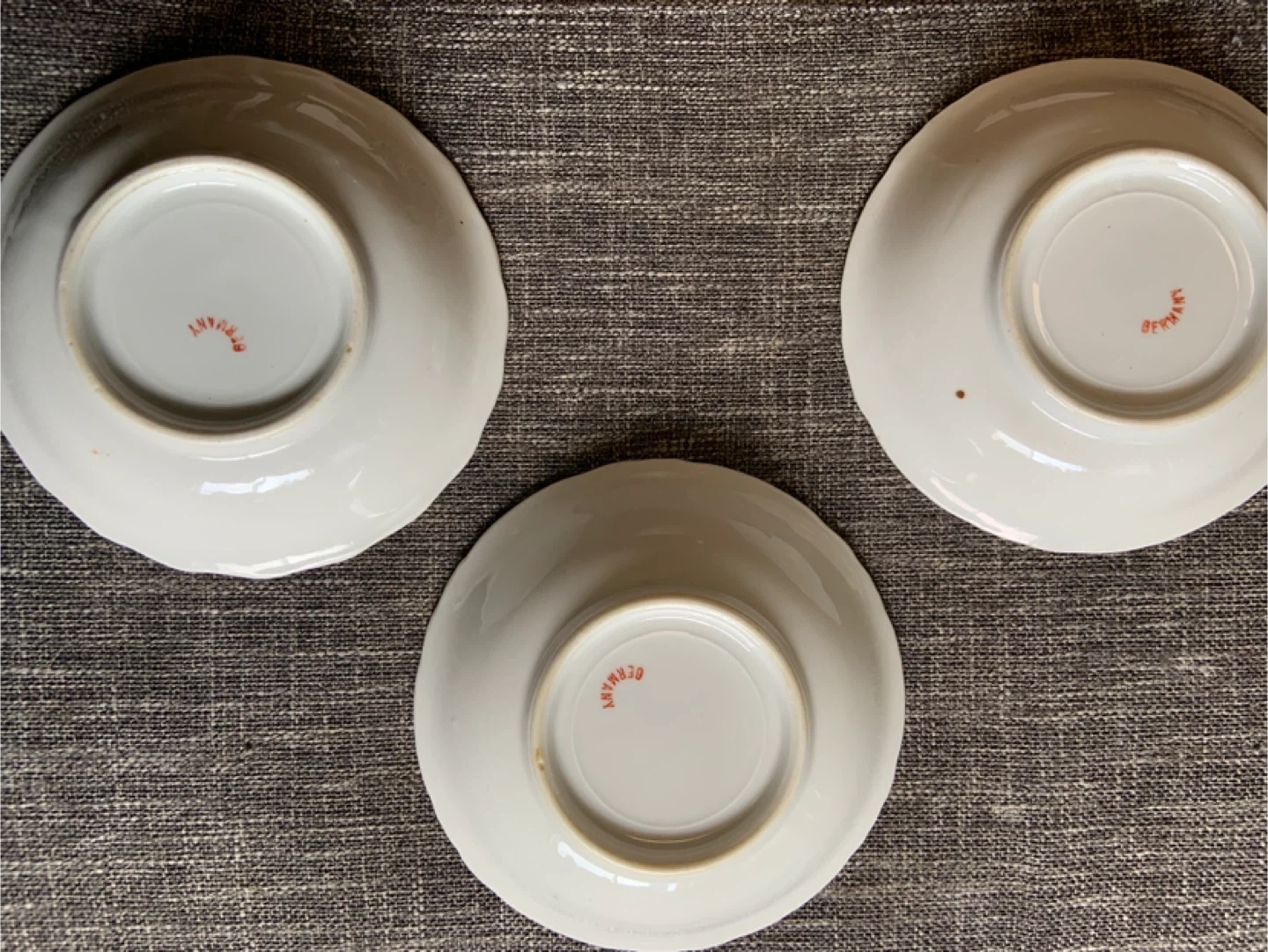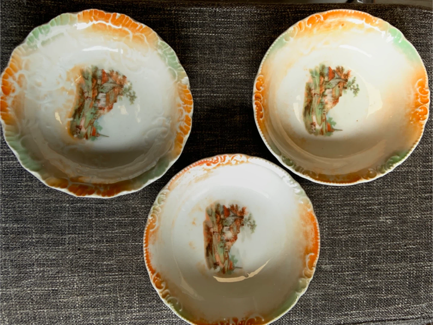 Selling a set of three antique porcelain bowls, made in Germany. Each bowl features a charming landscape scene in the centre and a decorative scalloped edge with orange and green accents. They'd be a lovely addition to any collection or a unique way to serve desserts or snacks