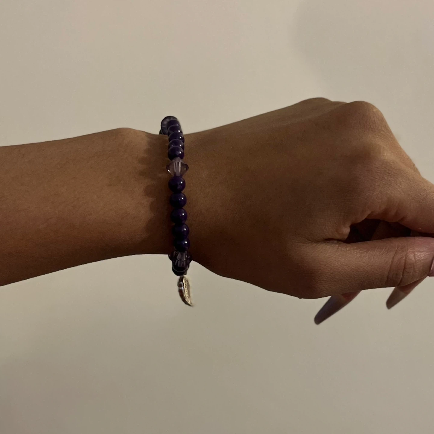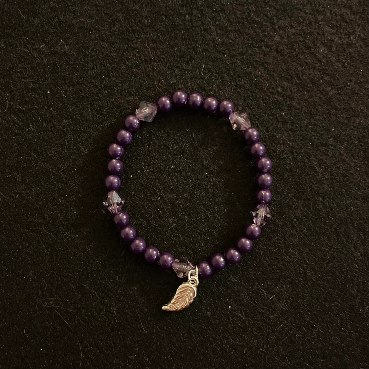 Giving away a cute purple beaded bracelet! It features dark purple beads and crystal-like beads, along with a little charm. It's in great condition and would make a lovely accessory! Made just this morning and ready to go!