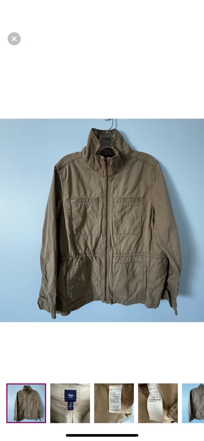 Classic Gap utility jacket in neutral khaki/tan.    •   Size XL    •   100% cotton    •   Full-zip front    •   Stand collar, elastic waist detail    •   Four functional front pockets    •   Chest ~22–23”    •   Length ~28–29” Condition: Excellent pre-owned. Timeless, versatile piece — perfect for layering and everyday wear. 🔖 #Gap #UtilityJacket #SafariJacket #KhakiJacket #CottonJacket #Streetwear #NeutralStyle #ClosetStaple