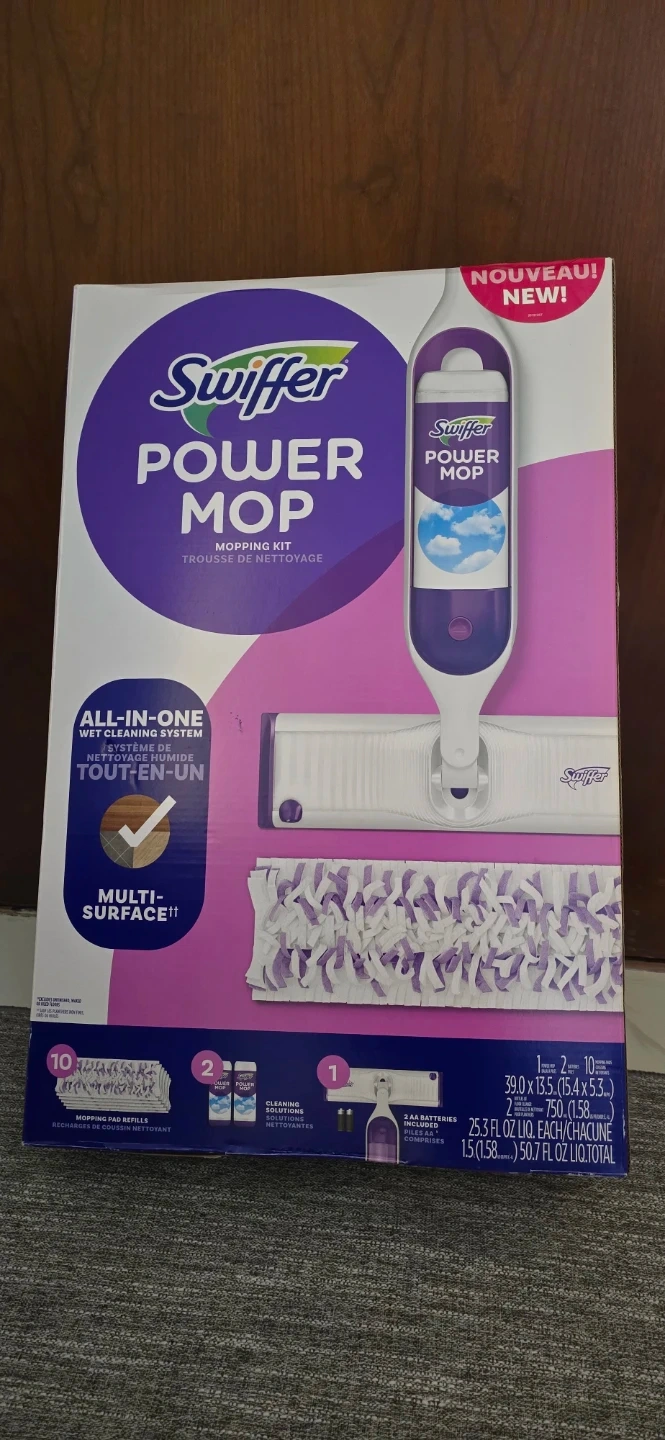 267I'm selling a brand new Swiffer Power Mop mopping kit! It's an all-in-one wet cleaning system perfect for multi-surface cleaning. The box includes 10 mopping pad refills and 2 cleaning solutions.