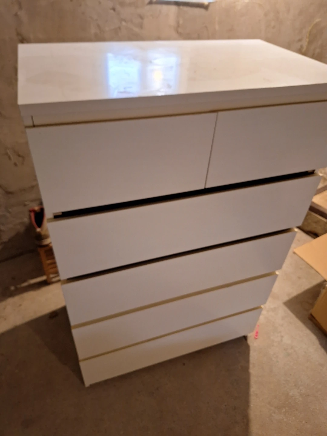 Selling a white dresser with five drawers. It's in used condition and has some scratches but it needs a new home! Perfect for adding storage to any bedroom or living space