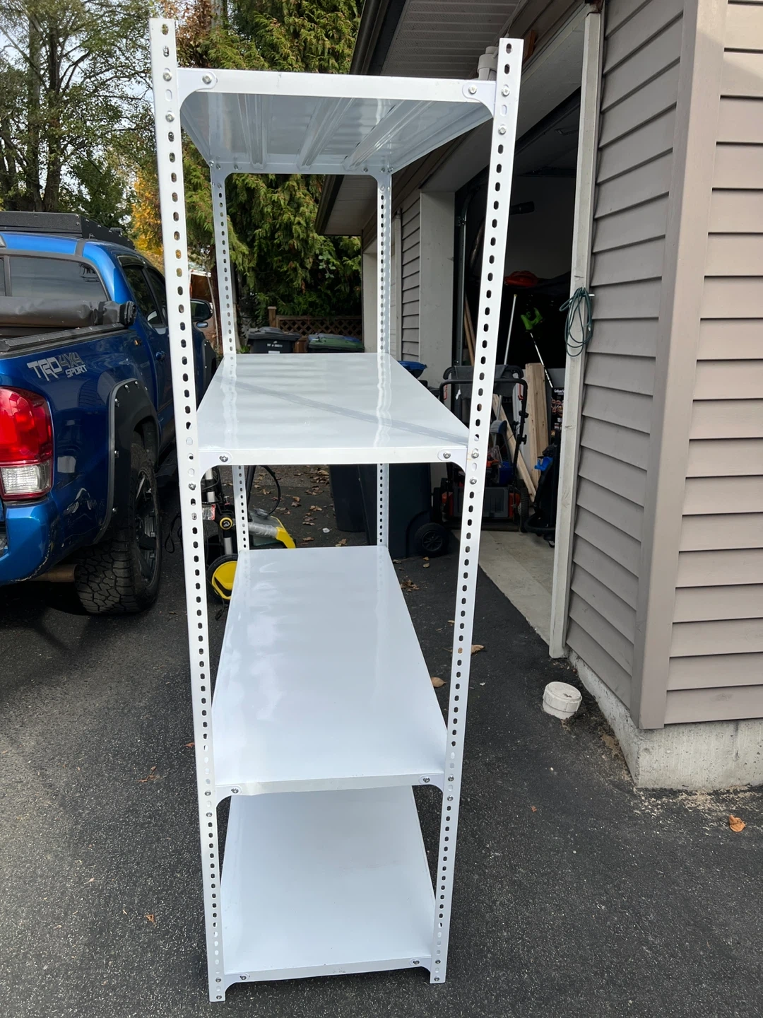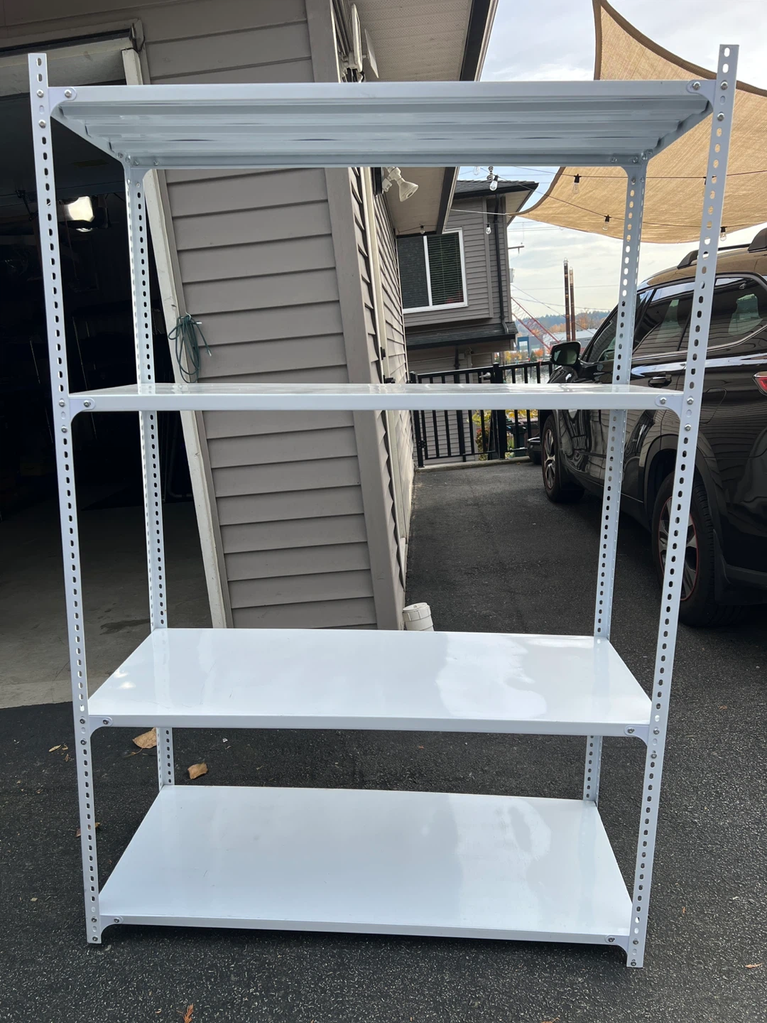 Here's a sturdy white metal shelving unit, perfect for organizing your garage, pantry, or storage room. It's in great shape and ready to use!