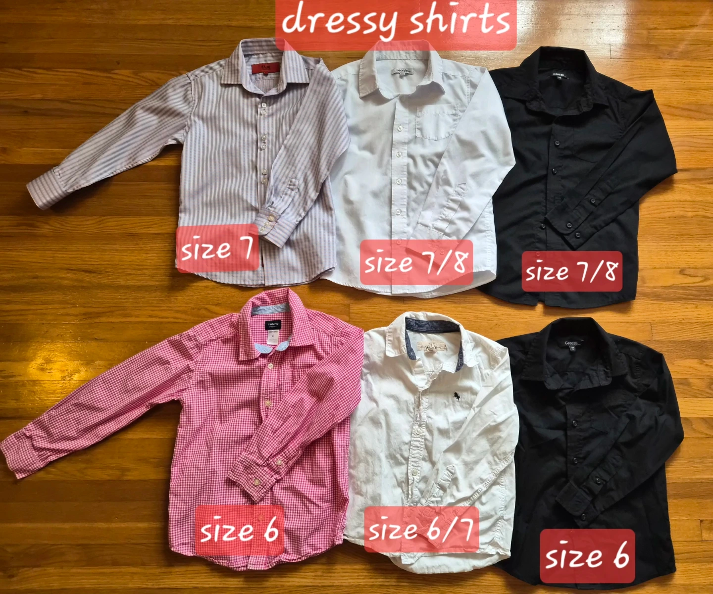 Selling a bundle of dressy shirts in various sizes. There are shirts in sizes 6, 6/7, 7, and 7/8. Brands include George and Carter's. Perfect for your growing kiddo! All for $25 or each $5
