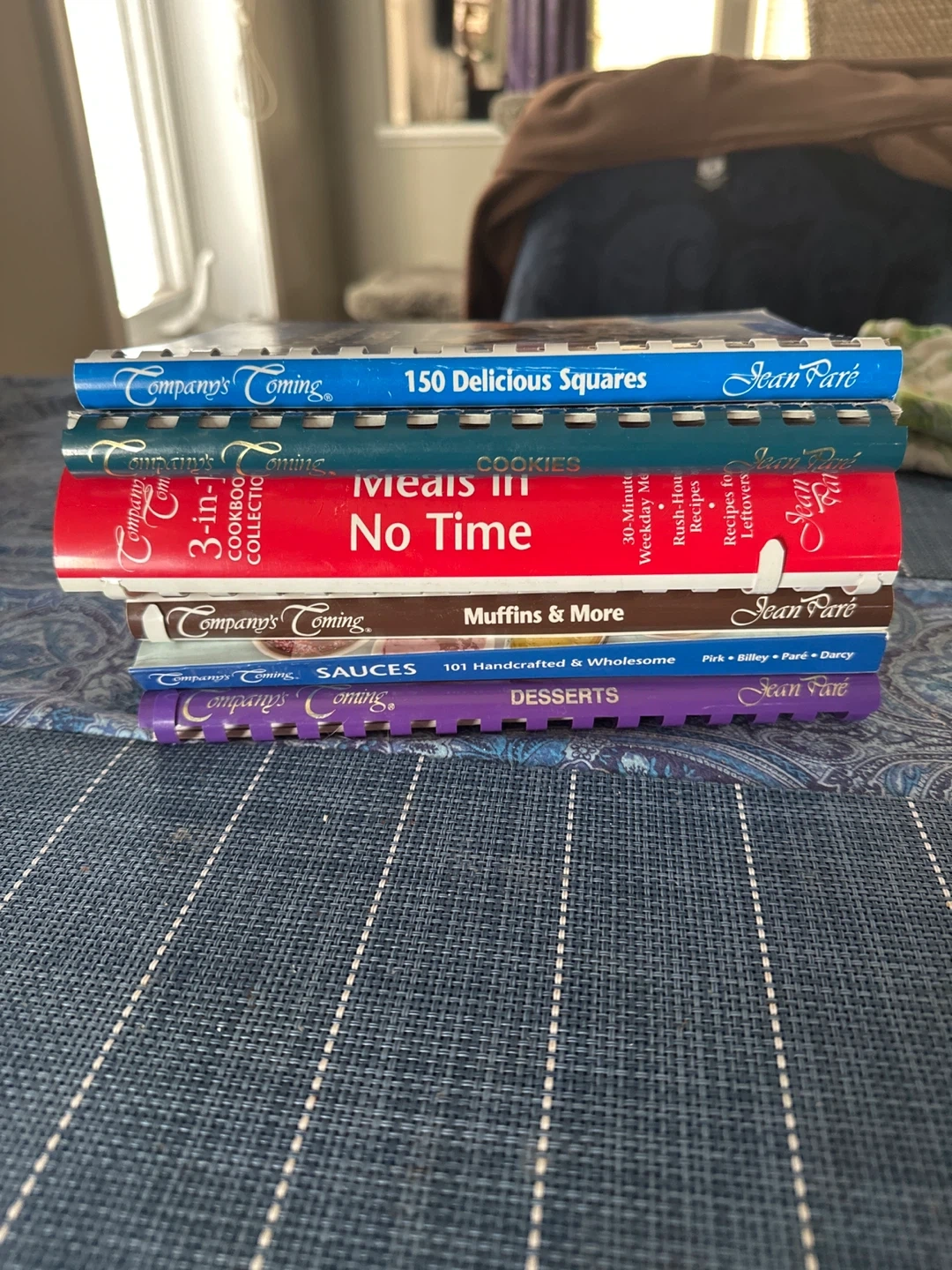 6 Company’s Coming Cookbooks, in various states of use, from new & never used, to well loved in good condition.