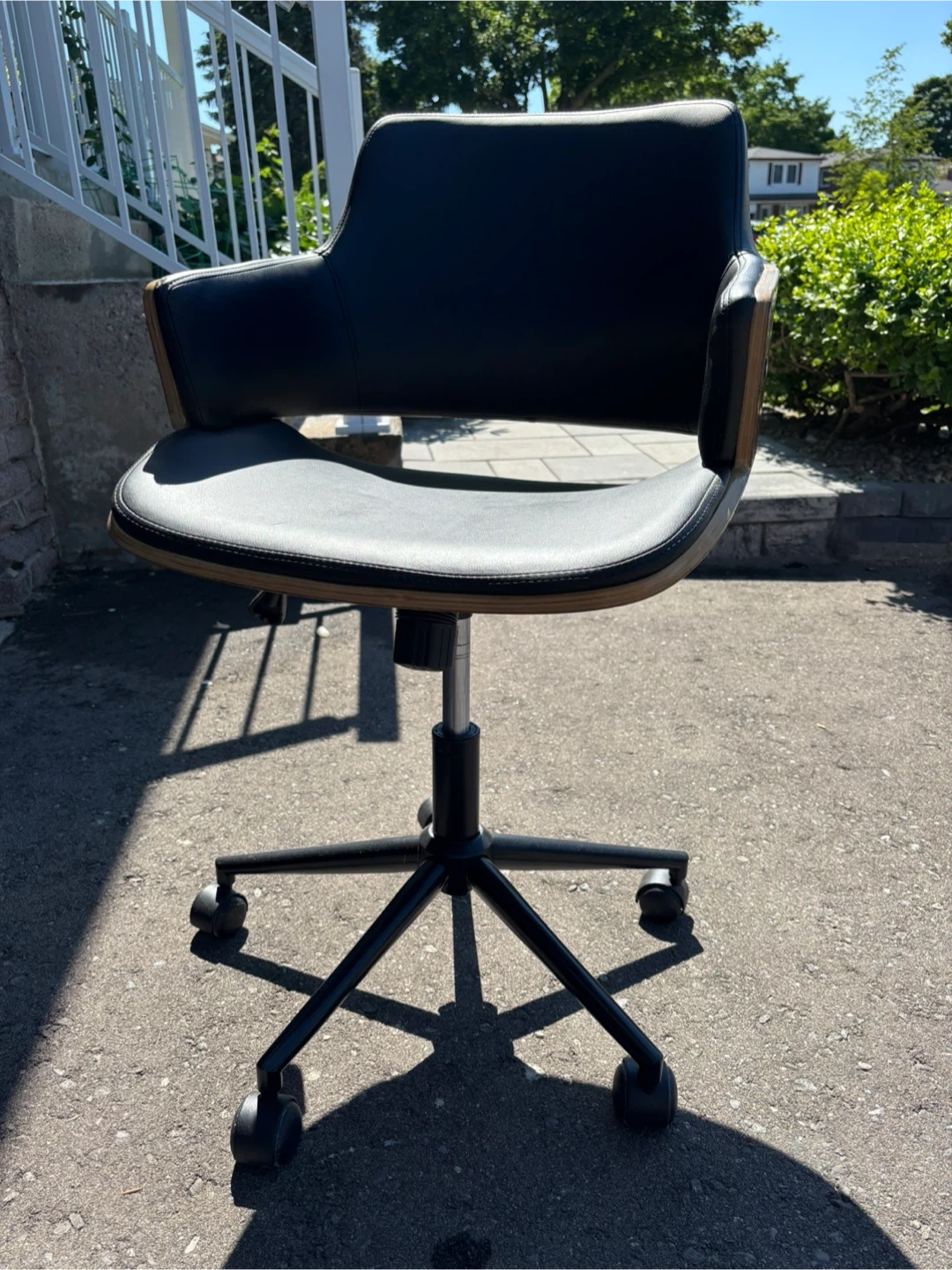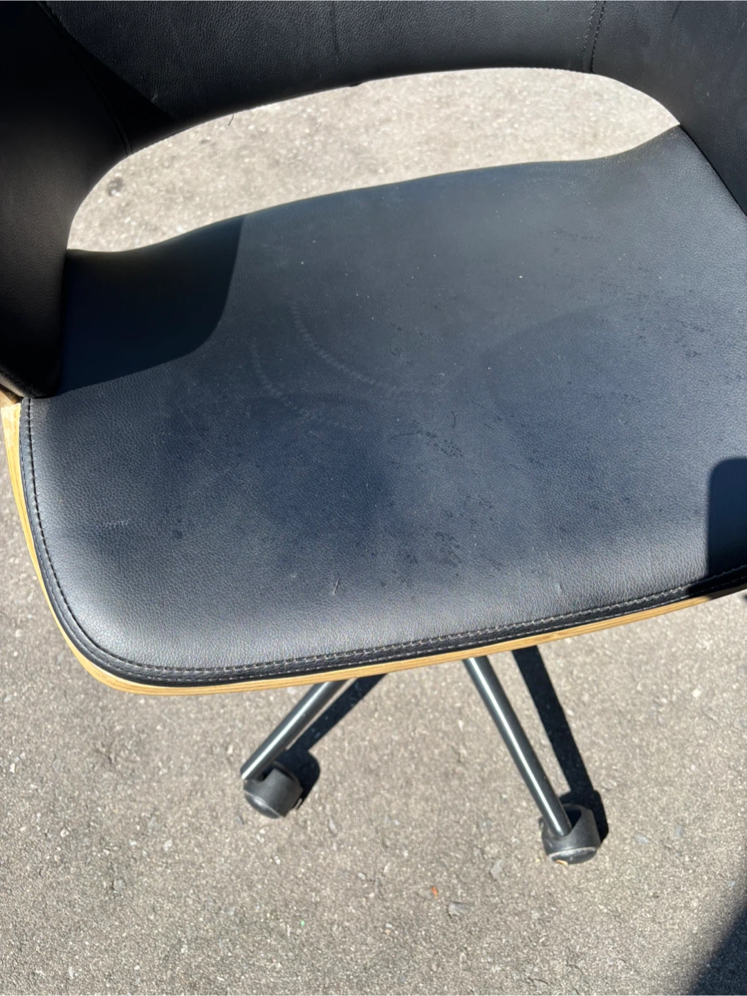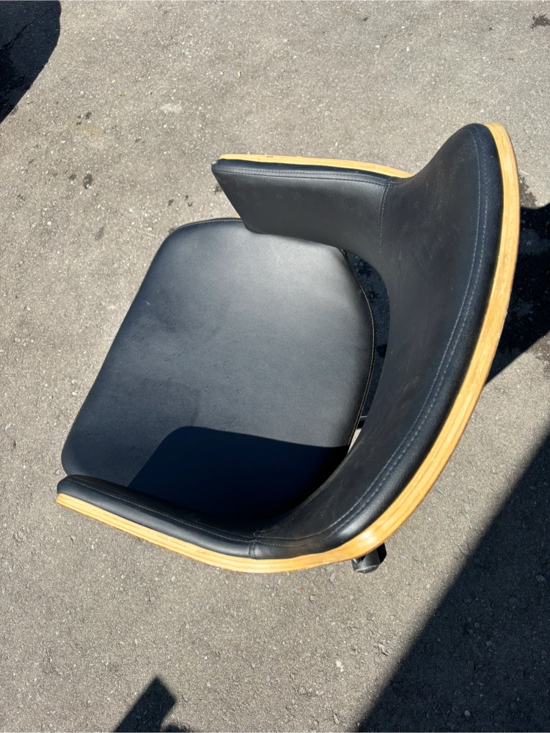 This office chair features a sleek design with black leather and wood accents. It's in okay condition and ready to add a touch of style to your workspace! See photos for marks
