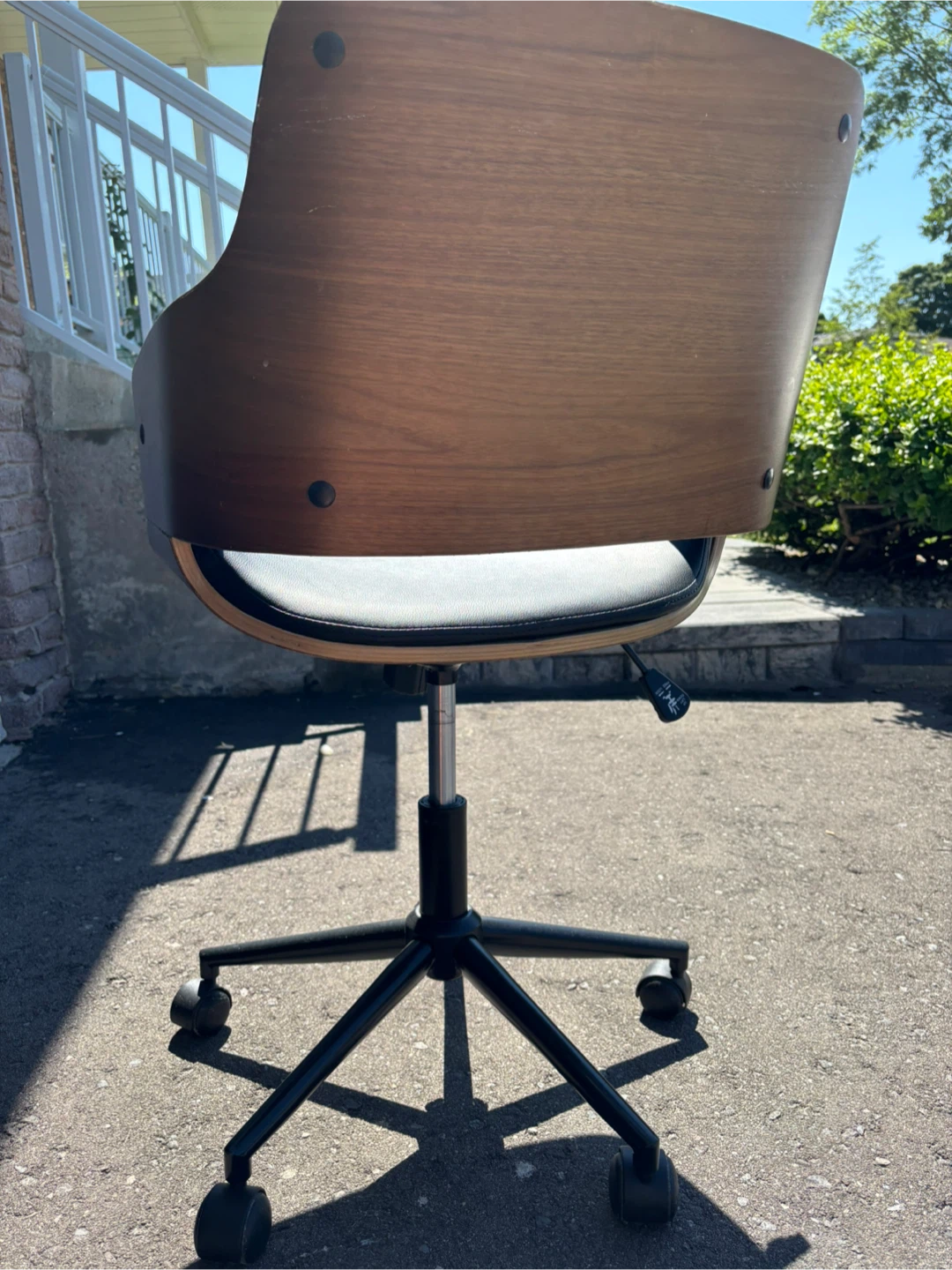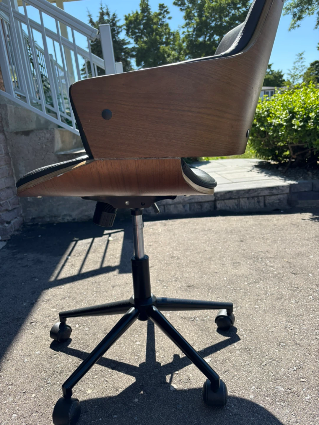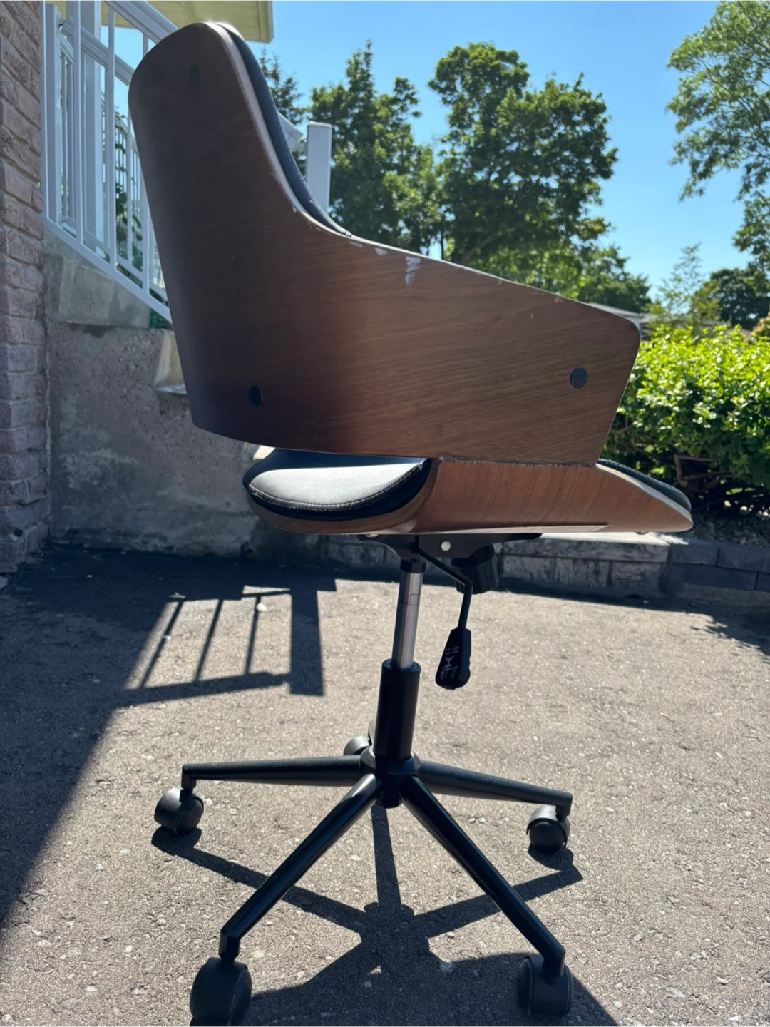 This office chair features a sleek design with black leather and wood accents. It's in okay condition and ready to add a touch of style to your workspace! See photos for marks