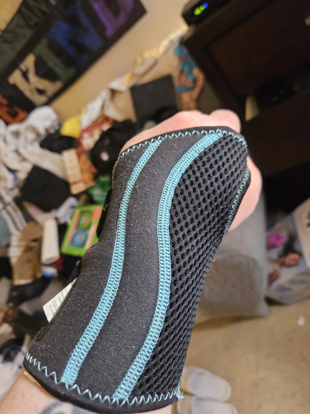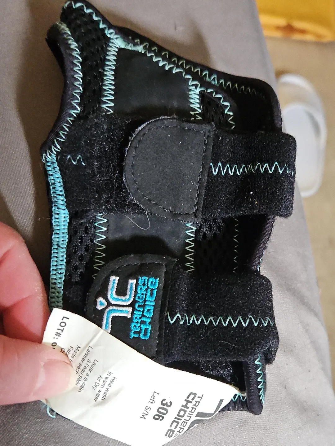 Here's a Trainers Choice wrist brace, size small/medium for the left hand. It's black with light blue accents and has velcro straps for a secure fit. Perfect if you need some extra support! It's bested suited for a wrist that is less than 7" around at the widest spot.
