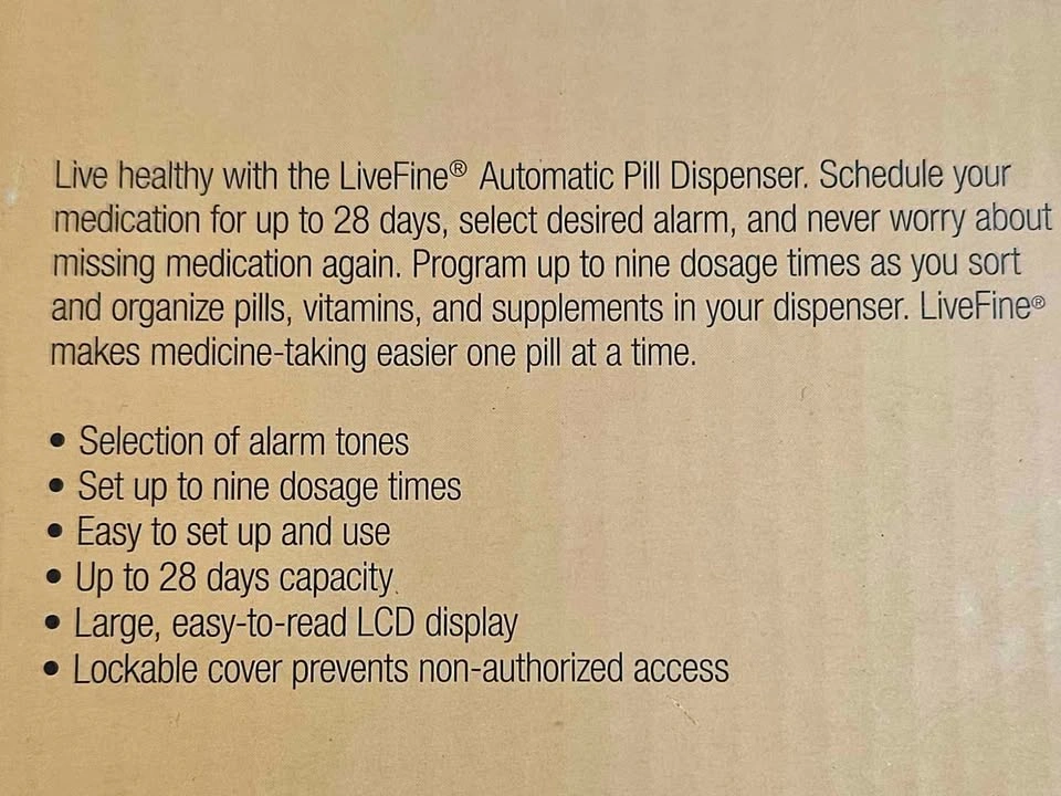 Live healthy with the Livefine Automatic Pill Dispenser. Schedule your medication for up to 28 days, select desired alarm, and never worry about missing medication again. Program up to nine dosage times as you sort and organize pills, vitamins, and supplements in your dispenser.
