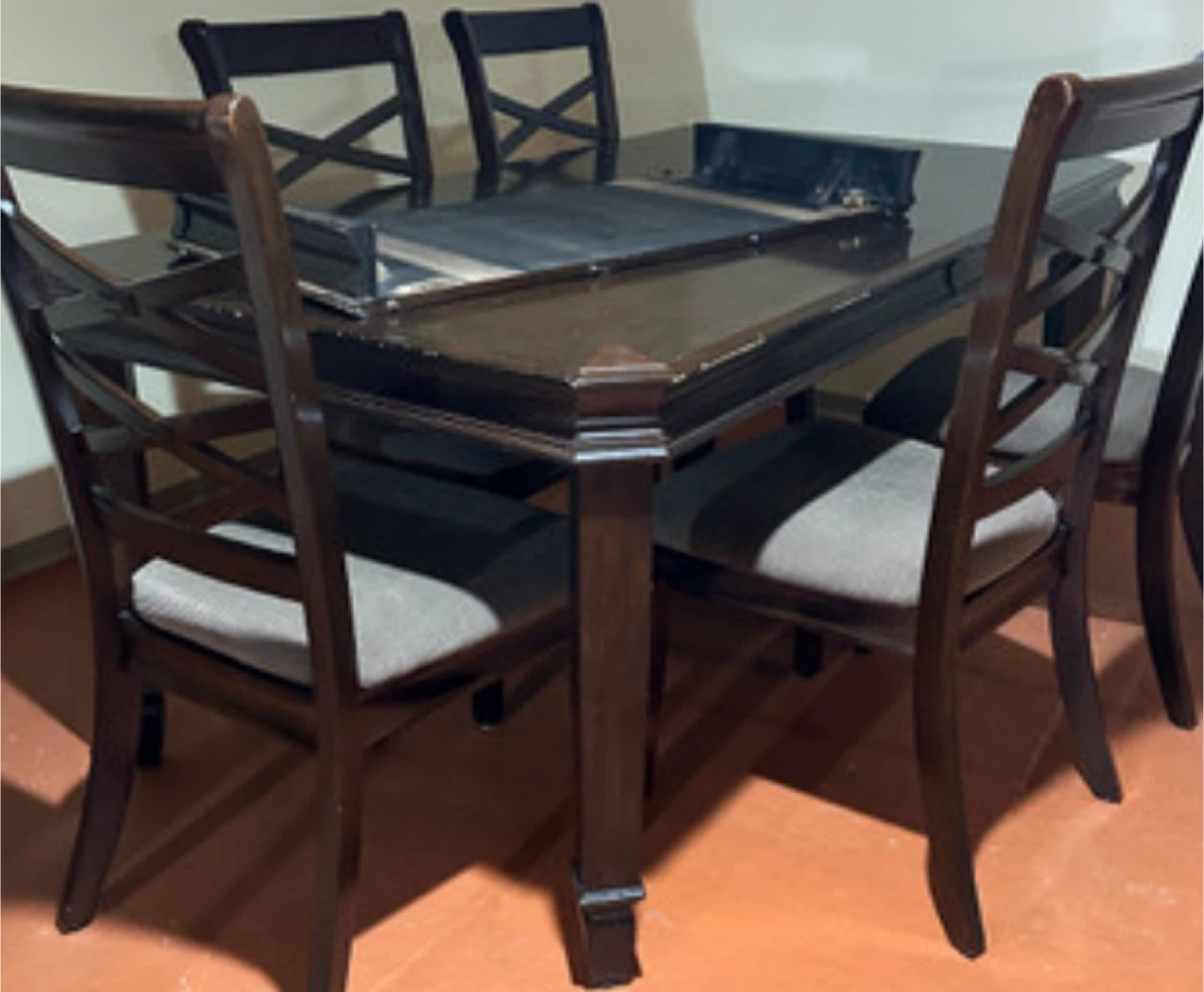 Selling an extendable dining table with six chairs. It's in good condition and ready to be the centrepiece of your dining room.