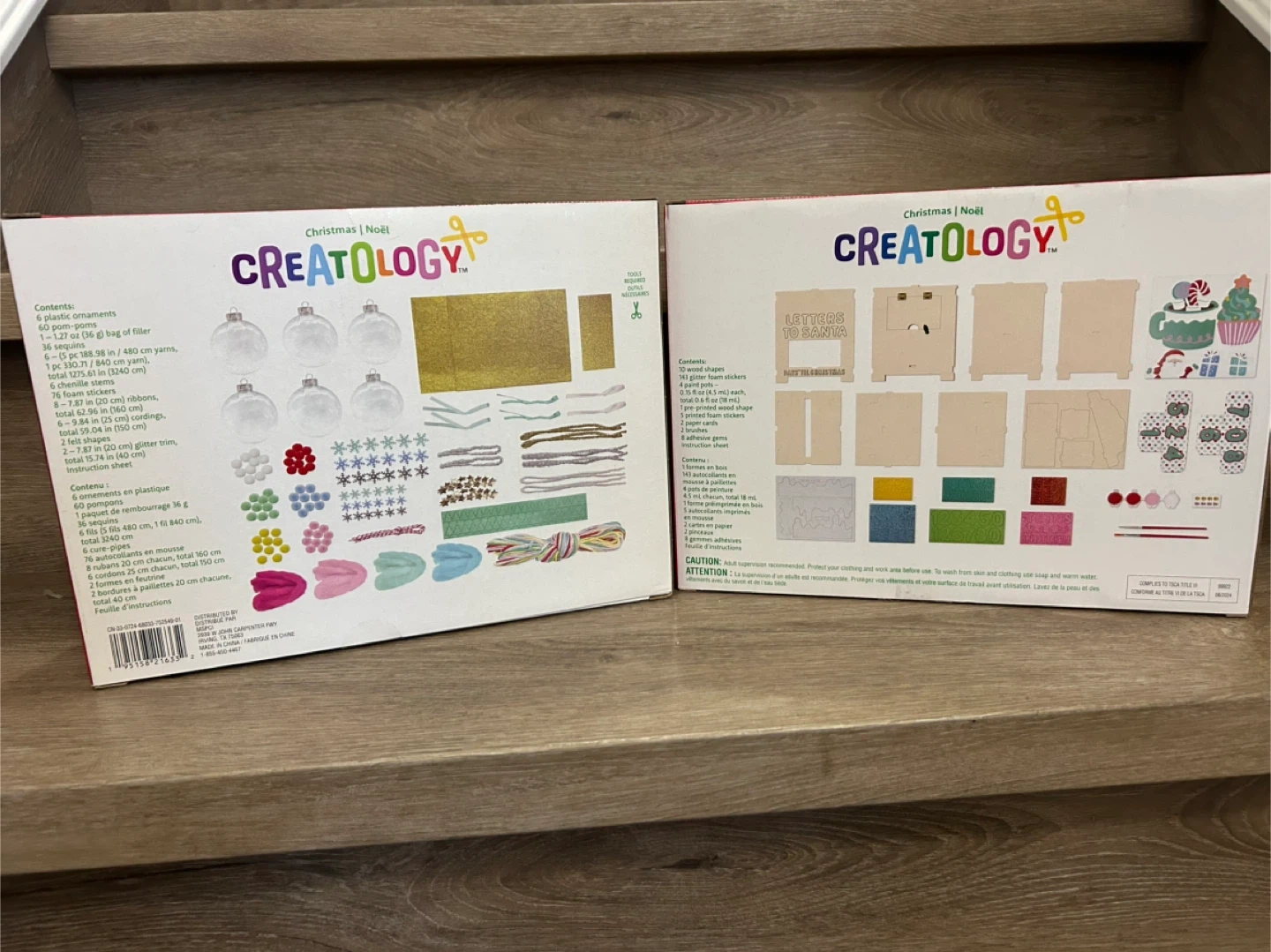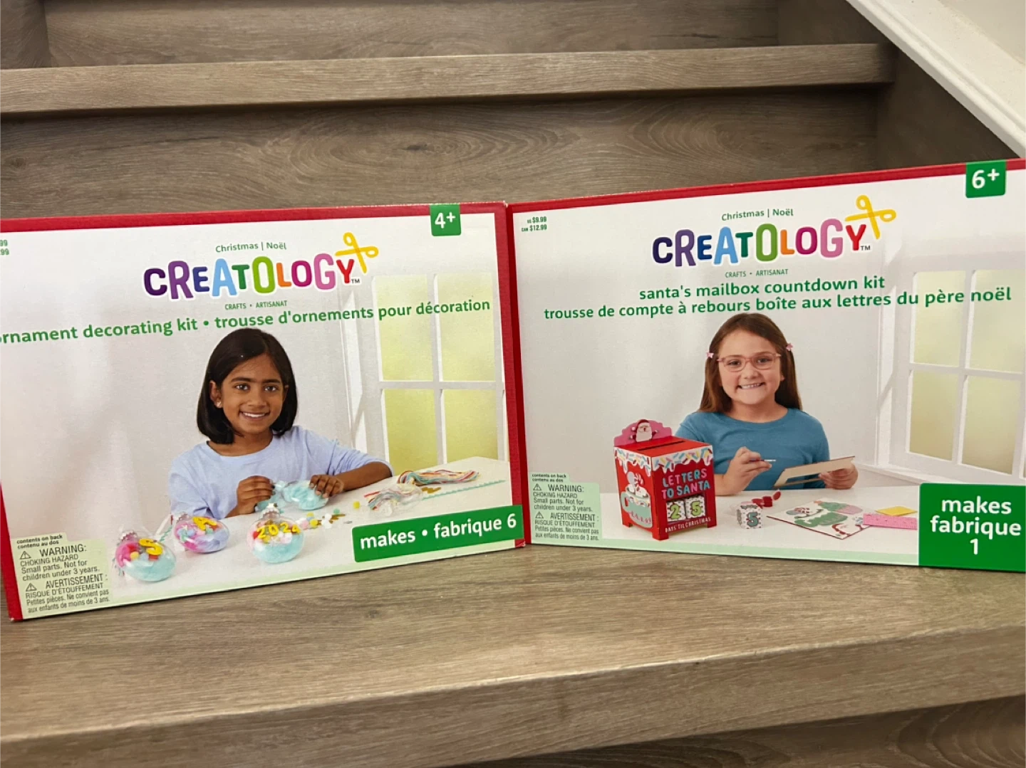 two Creatology Christmas craft kits One is an ornament decorating kit that makes 6 ornaments, and the other is a Santa's mailbox countdown kit that makes 1 mailbox. Both kits are brand new and ready for some holiday crafting fun!