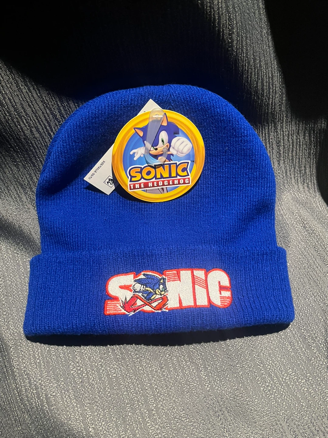 Check out this brand new Sonic the Hedgehog beanie! It's a vibrant blue and features the Sonic logo. Perfect for any Sonic fan!