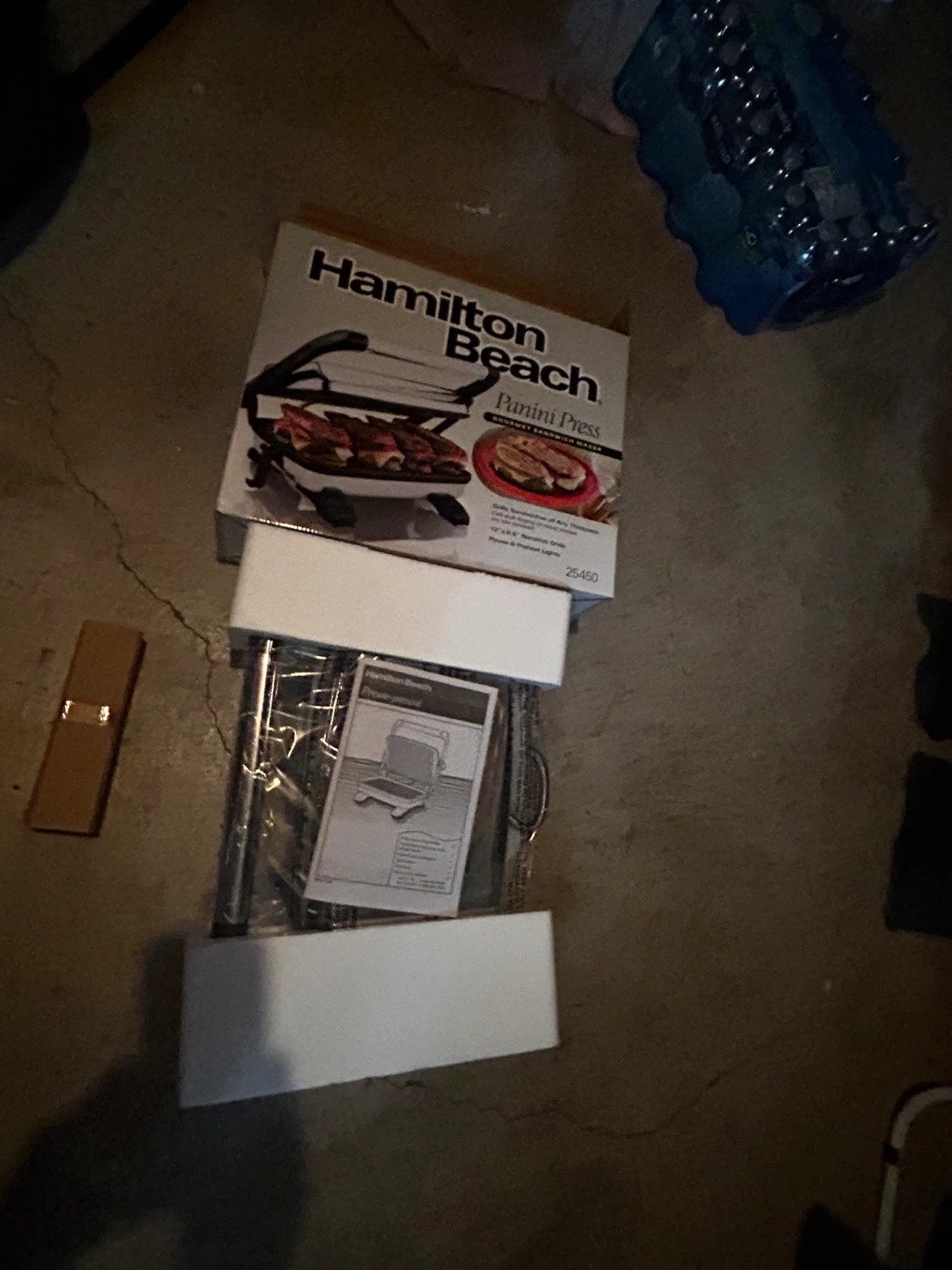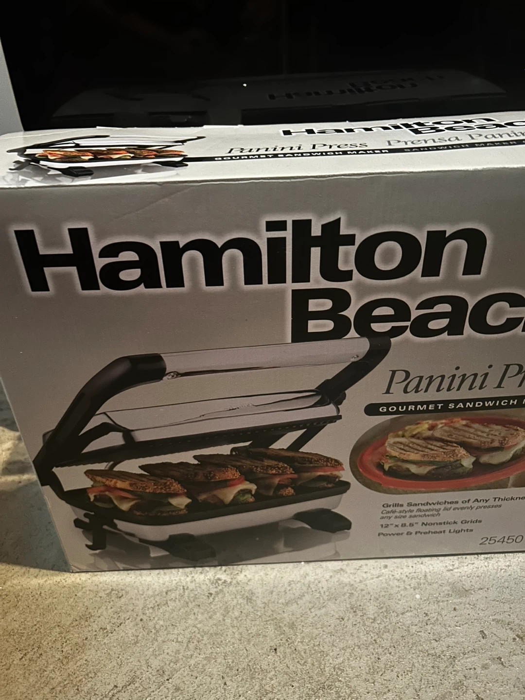 Selling a Brand New Hamilton Beach Panini Press, a gourmet sandwich maker! It's brand new and still in its original box. This panini press features 12" x 8.5" nonstick grids and power & preheat lights. Perfect for grilling sandwiches of any thickness, with a café-style floating lid that evenly presses sandwiches.