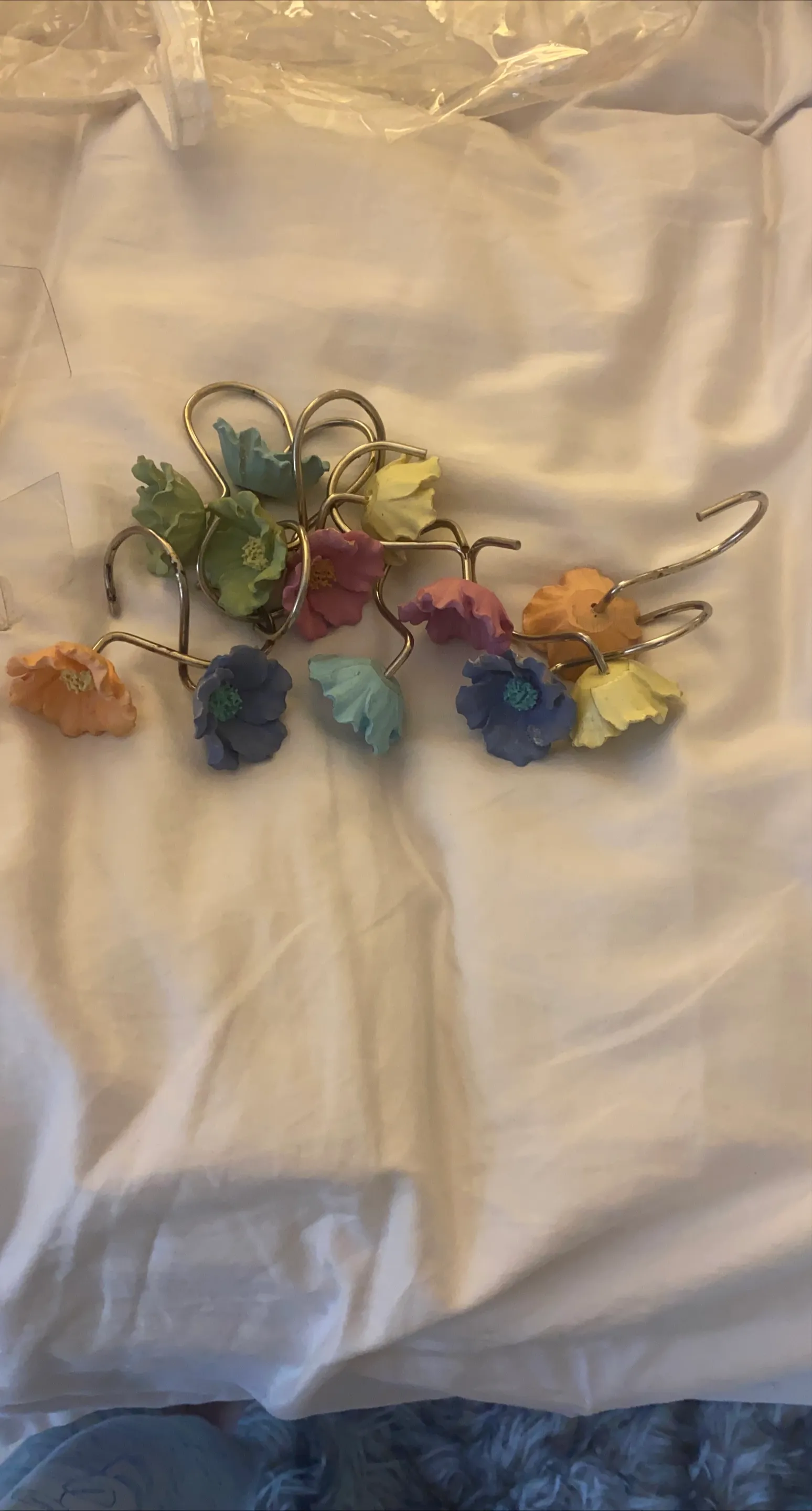 Here's a set of 12 shower curtain hooks with cute floral designs! They're in great condition and ready to add a touch of spring to your bathroom. The flowers are in a variety of pastel colours.