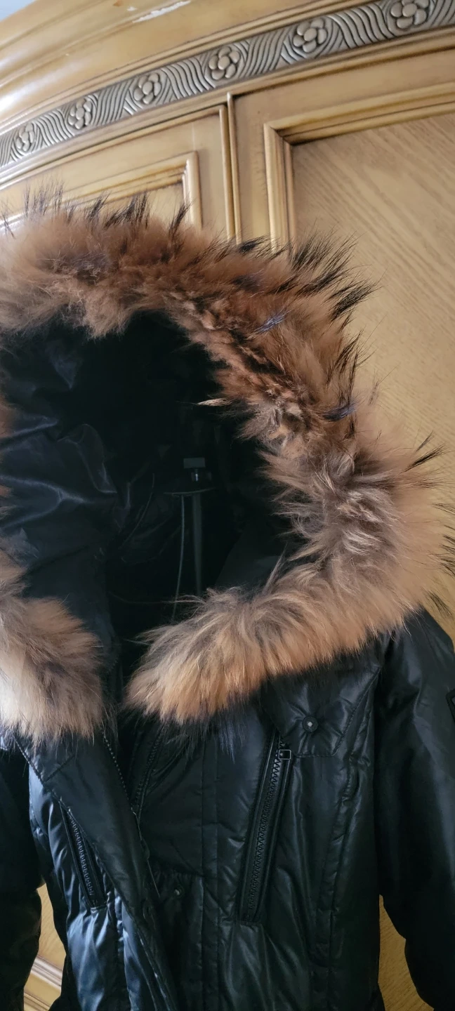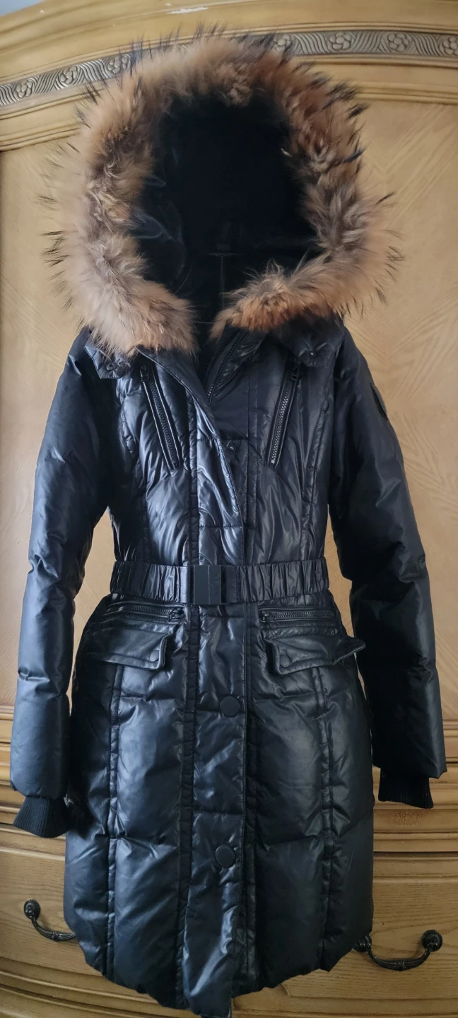 Selling a Ateliernior by Rudsak down winter coat. It's black and features a fur-trimmed hood and a belted waist. Perfect for staying warm during the cold Canadian winters!
