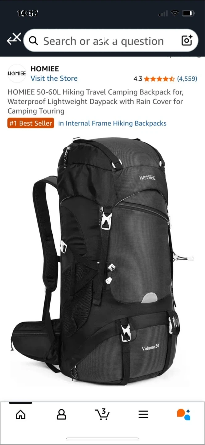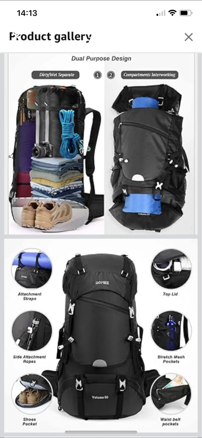 Selling a HOMIEE 50-60L hiking backpack. It's waterproof and lightweight, perfect for camping and touring. It has a dual-purpose design with compartments for wet and dry items. The backpack has attachment straps, side attachment ropes, a top lid, stretch mesh pockets, a shoes pocket, and waist belt pockets.
