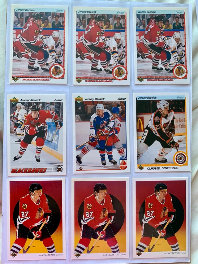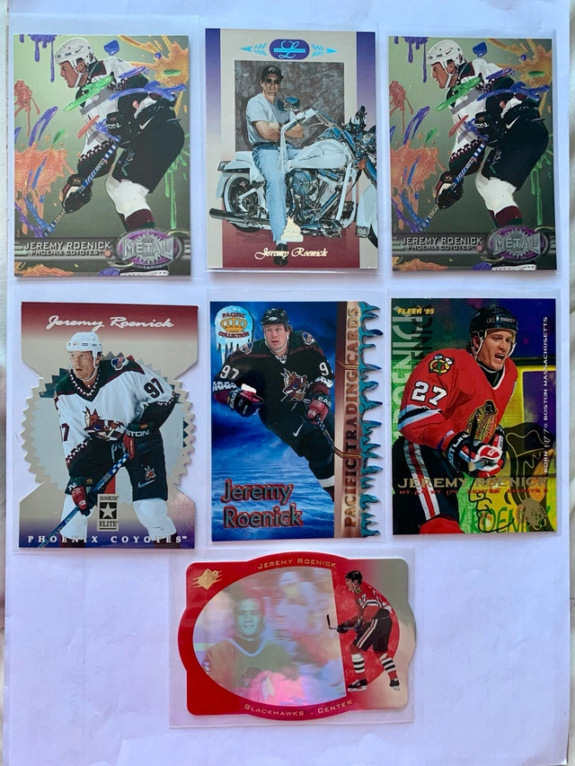 Explore the world of ice hockey with a collection of 25 NHL cards featuring Jeremy Roenick. With a career spanning across teams like the Chicago Blackhawks and Phoenix Coyotes, these cards capture significant moments of Roenick's impact on the sport. Each card is a piece of hockey history, perfect for fans and collectors alike. Dive into the National Hockey League with these sports trading cards, an excellent way to commemorate the legacy of player Jeremy Roenick. Whether for your personal collection or as a thoughtful gift for a hockey enthusiast, these cards are a great way to celebrate the spirit and excitement of the game. Condition: New More Info: Sports Collectibles For Sale By: Owner Curbside pick up: Yes Cash accepted: Yes