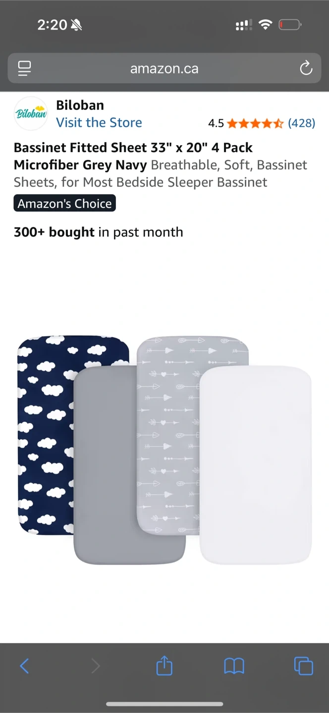 Selling a 4-pack of Biloban bassinet fitted sheets. These are 33" x 20" and made of a soft, breathable microfiber material. The pack includes grey and navy colours.