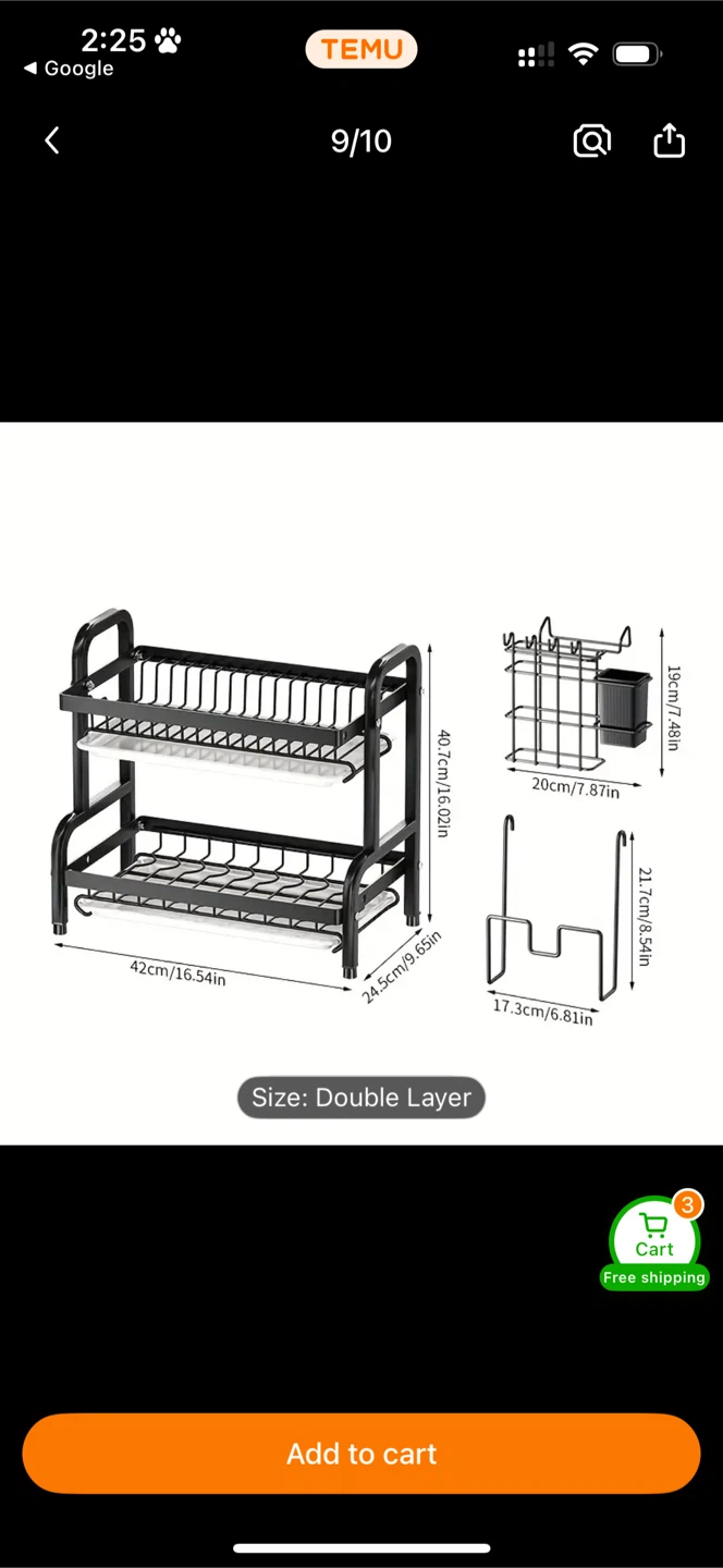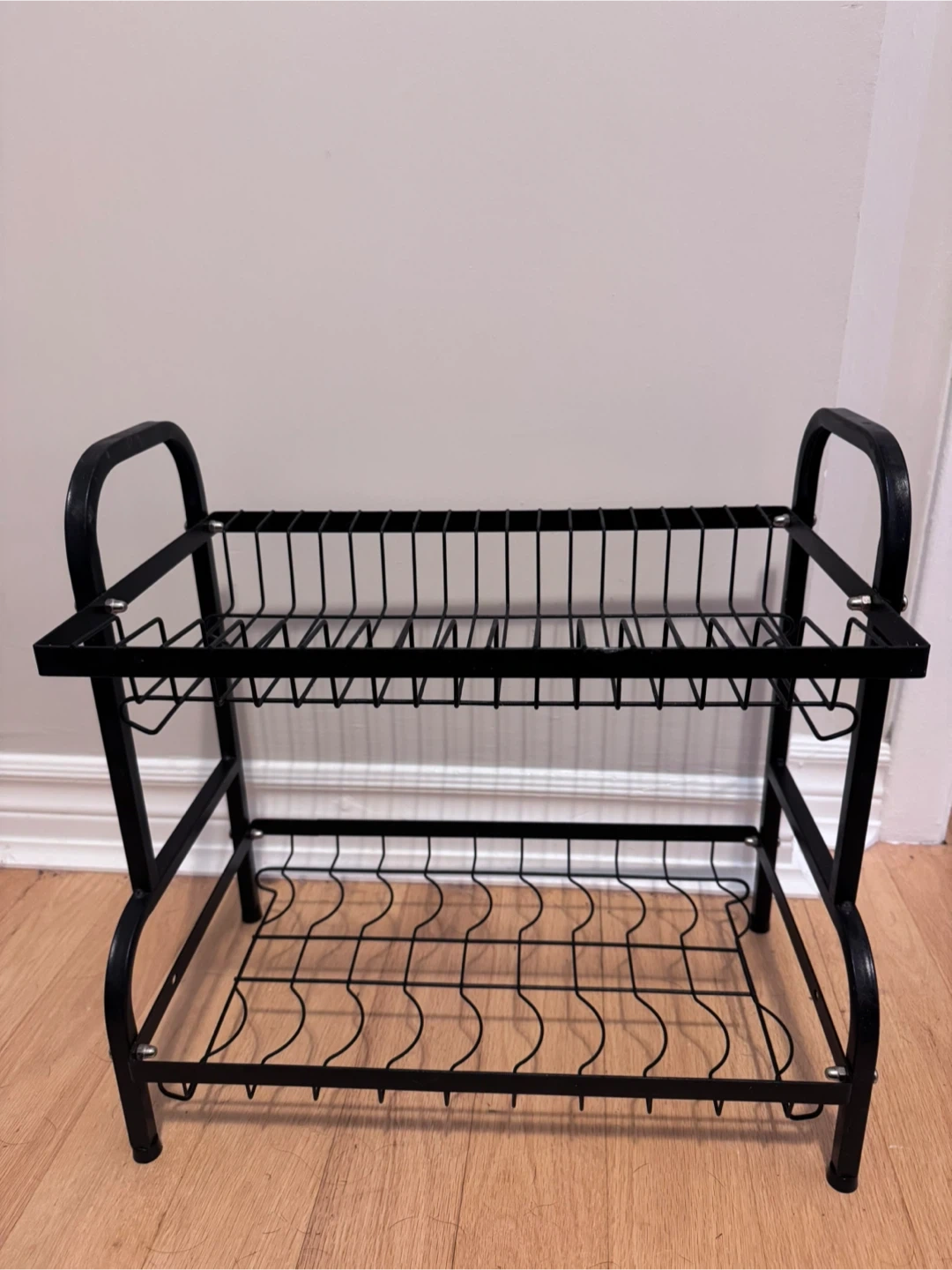 This is a black, double-layer dish rack that's perfect for keeping your kitchen organized! It has a drainage system to keep your dishes dry and clean. Dimensions are approximately 42cm (16.54in) wide, 24.5cm (9.65in) deep, and 40.7cm (16.02in) high Bought it for our new house but no space . Lost the tray and side spoon during transit . Original price is 36.58$ + tax in Temu Open to offer