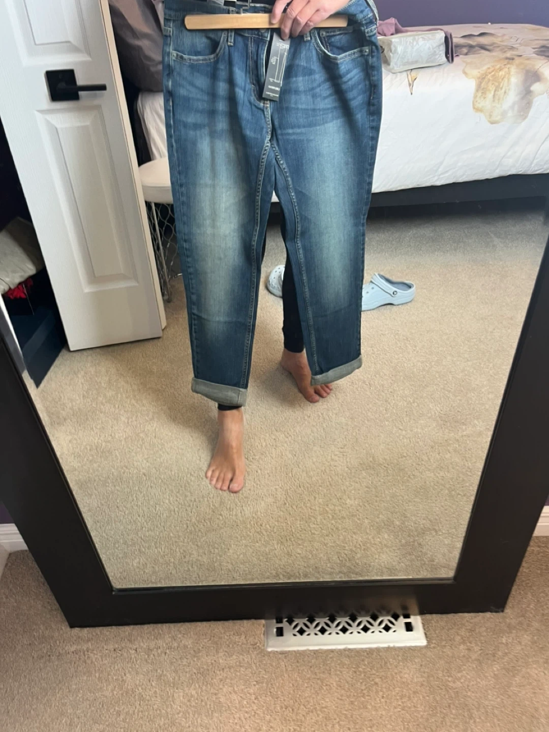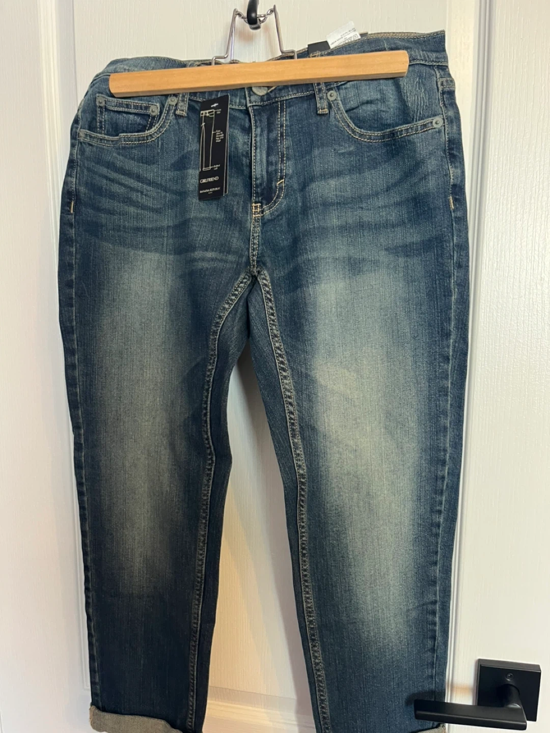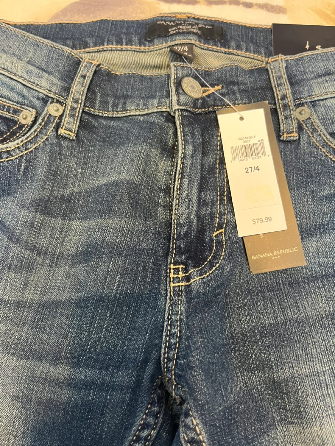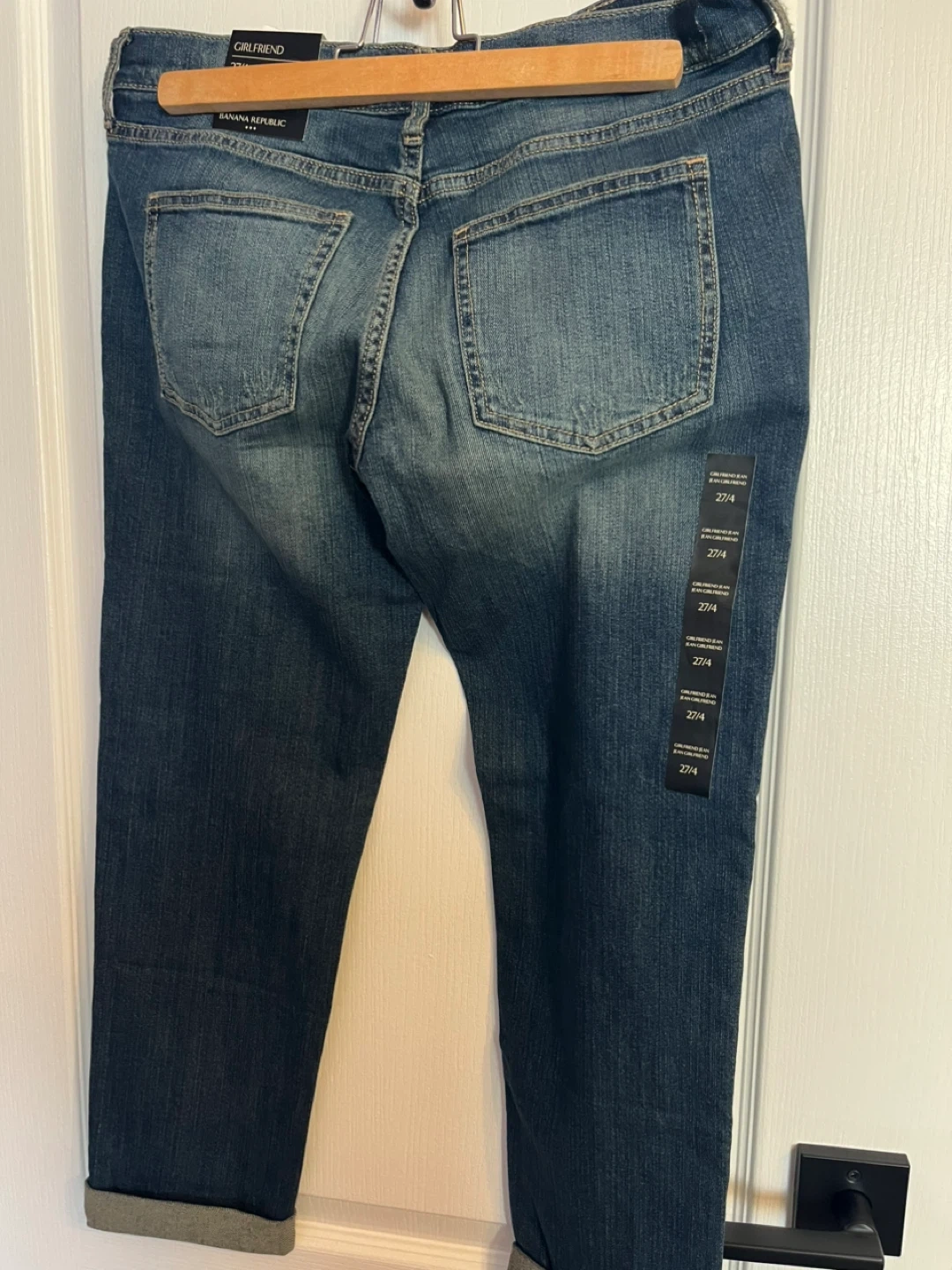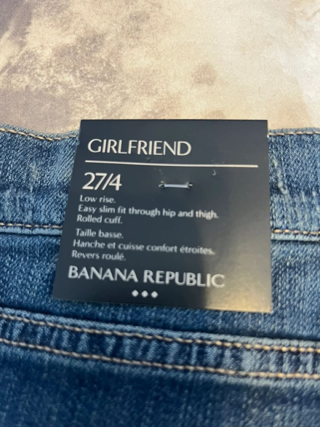 Selling a pair of Banana Republic Girlfriend jeans in size 27/4. They have a low rise and a slim fit through the hip and thigh. These jeans also feature a rolled cuff for a casual look. Originally bought for $79.99!