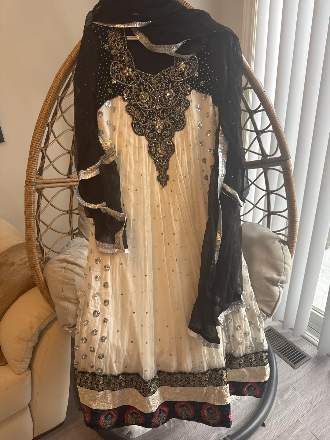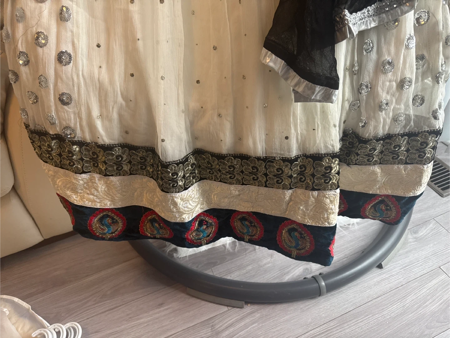 Here's a beautiful salwar kameez suit! It features intricate embroidery and embellishments. The color scheme is a mix of cream, black, and silver. Perfect for special occasions or cultural events!