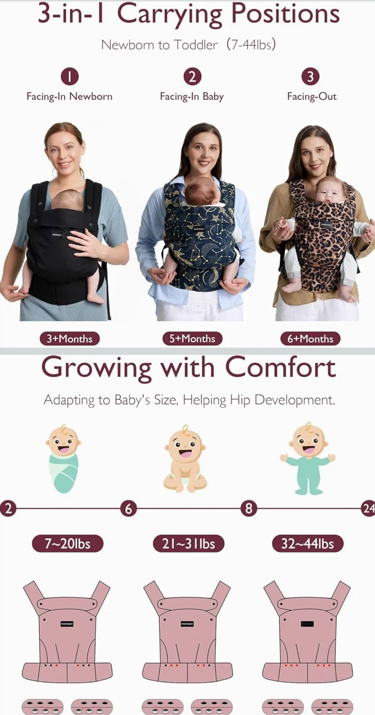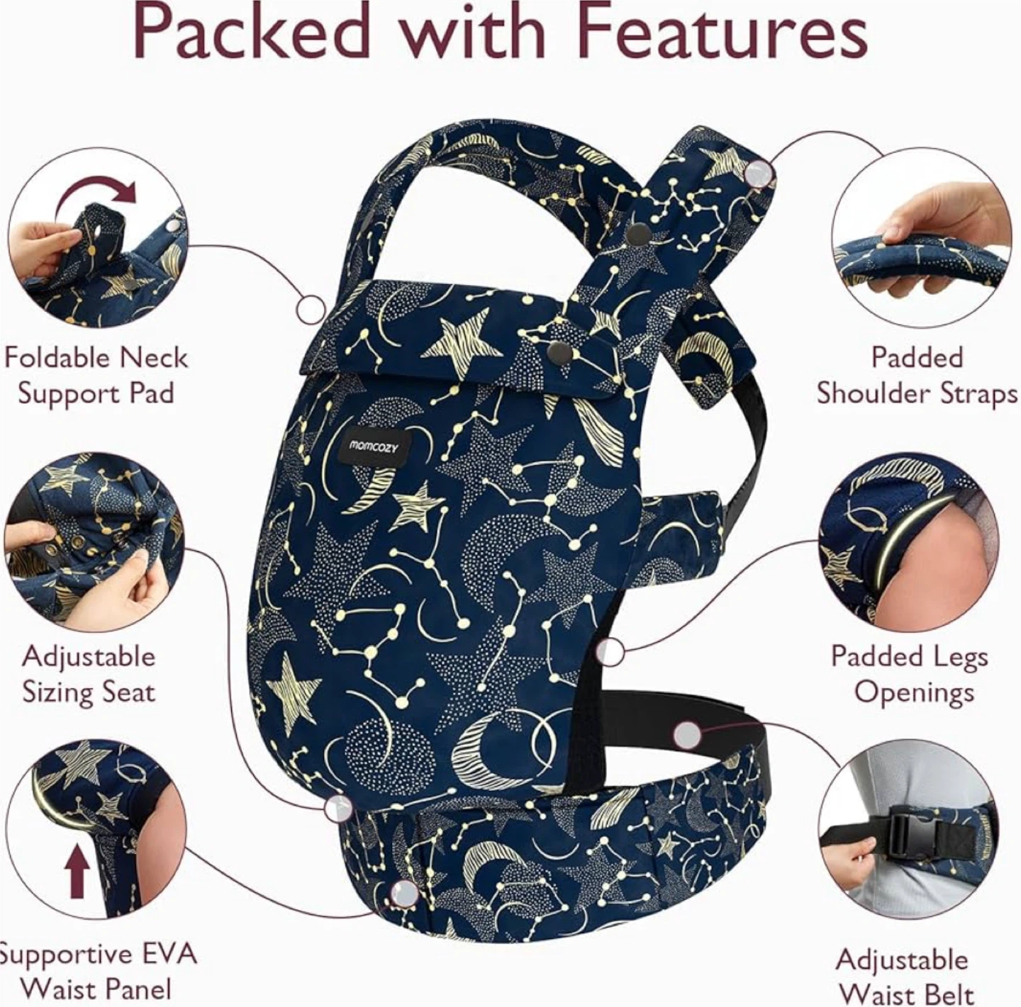 This Momcozy baby carrier is perfect for newborns to toddlers, supporting weights from 7-44 lbs. It features a foldable neck support pad, padded shoulder straps, and adjustable sizing seat for your baby's comfort. The supportive EVA waist panel and adjustable waist belt ensure a comfortable fit for you too! The carrier is in the Starry Sky design. Amazon sells this for $79.99. Received as a gift. No gift receipt. Thank you!