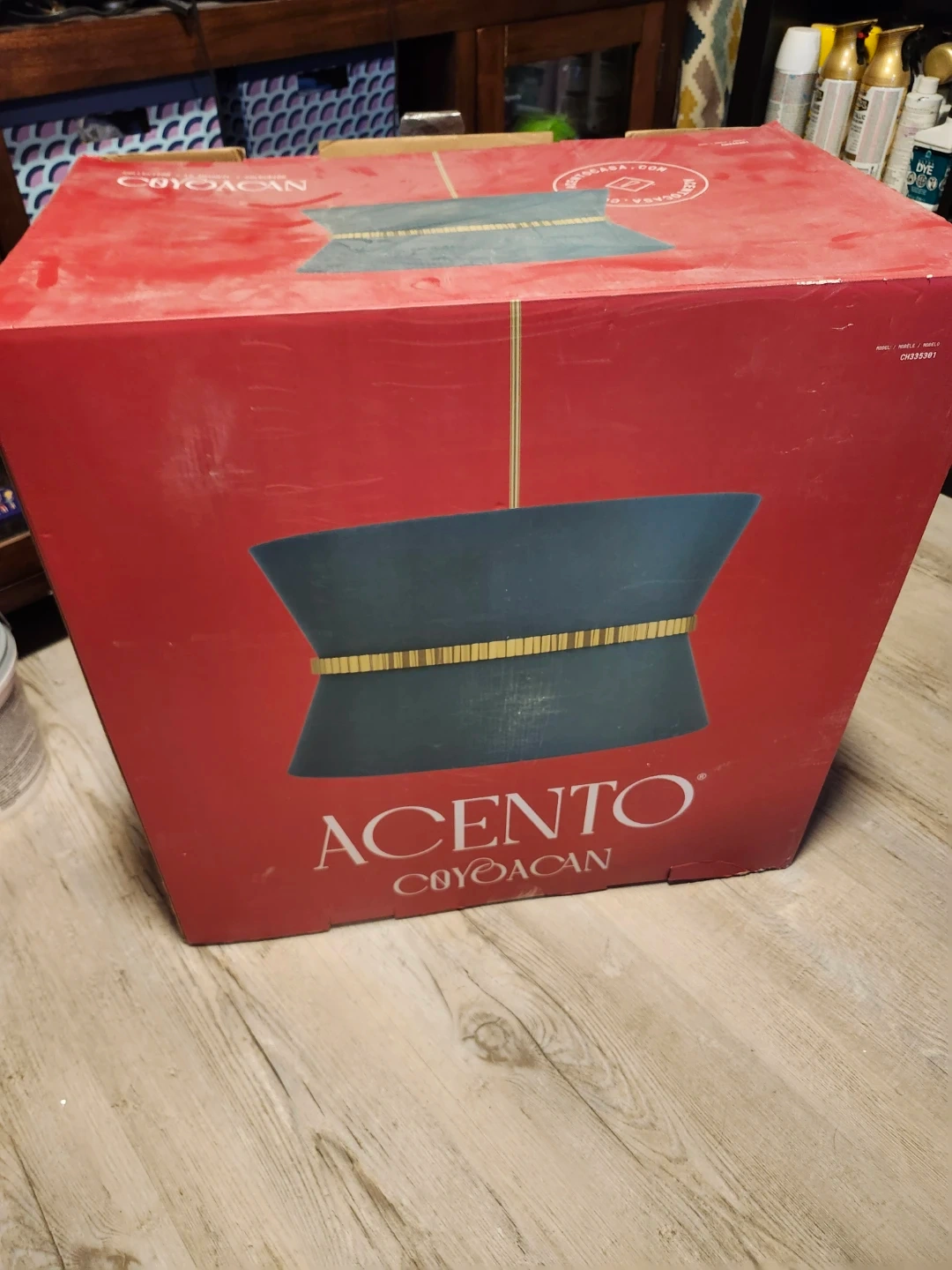 Brand new light fixture, still in the box (we bought 2 originally). Adjustable height for hanging it, has champagne bronze metal accents and is a dark blue colour.