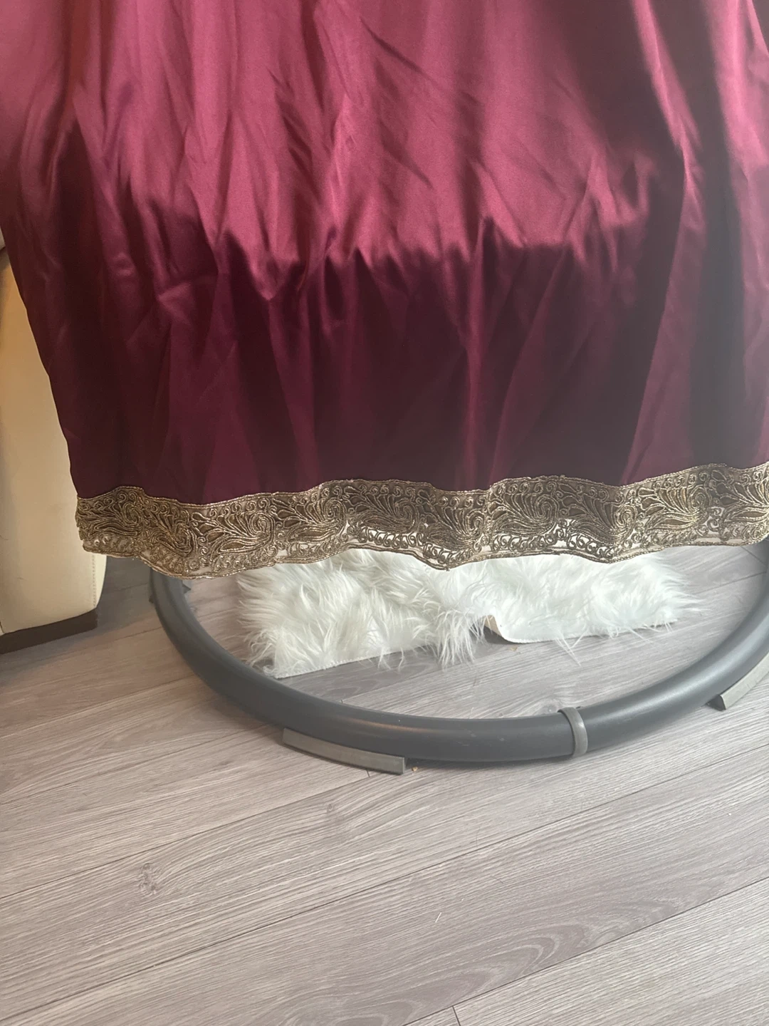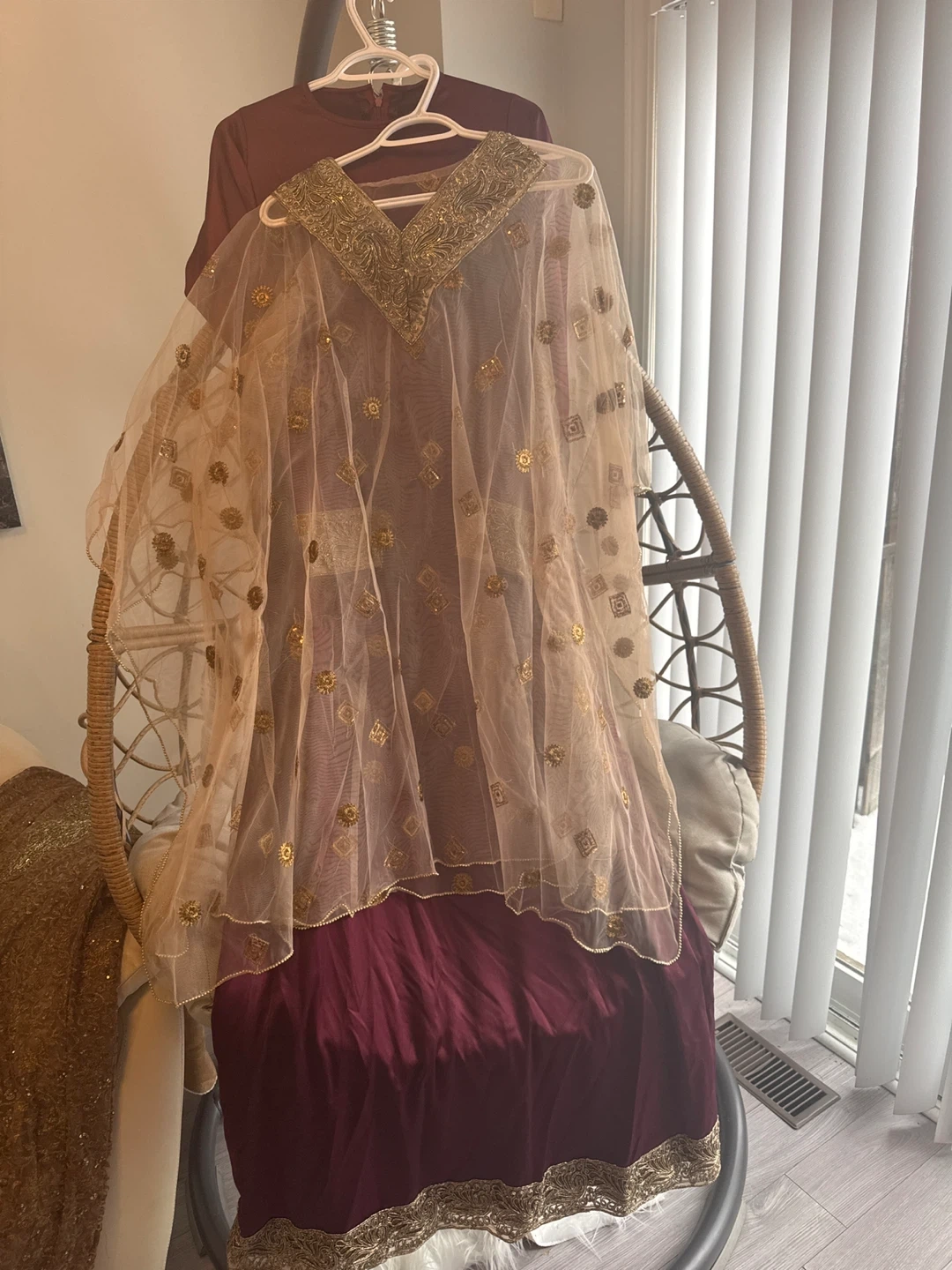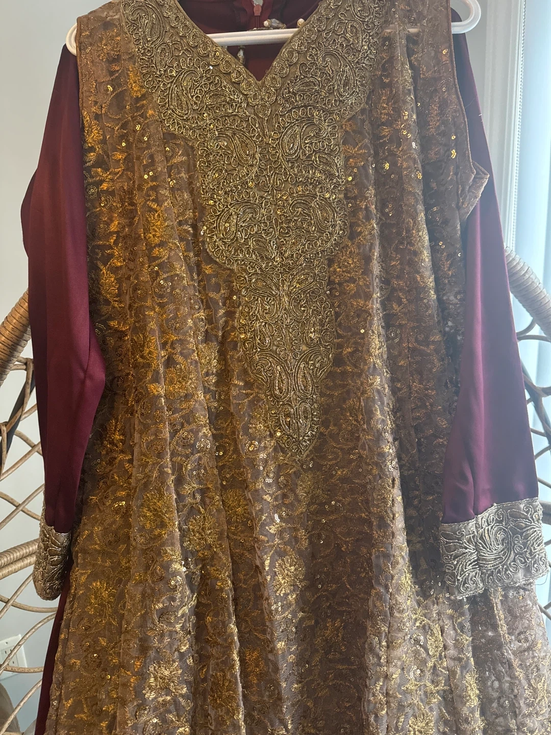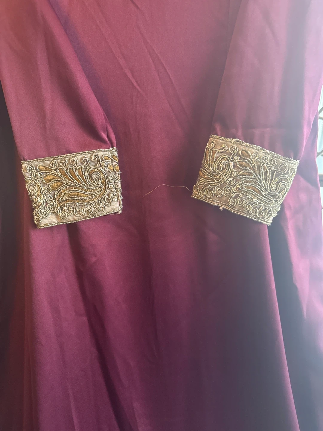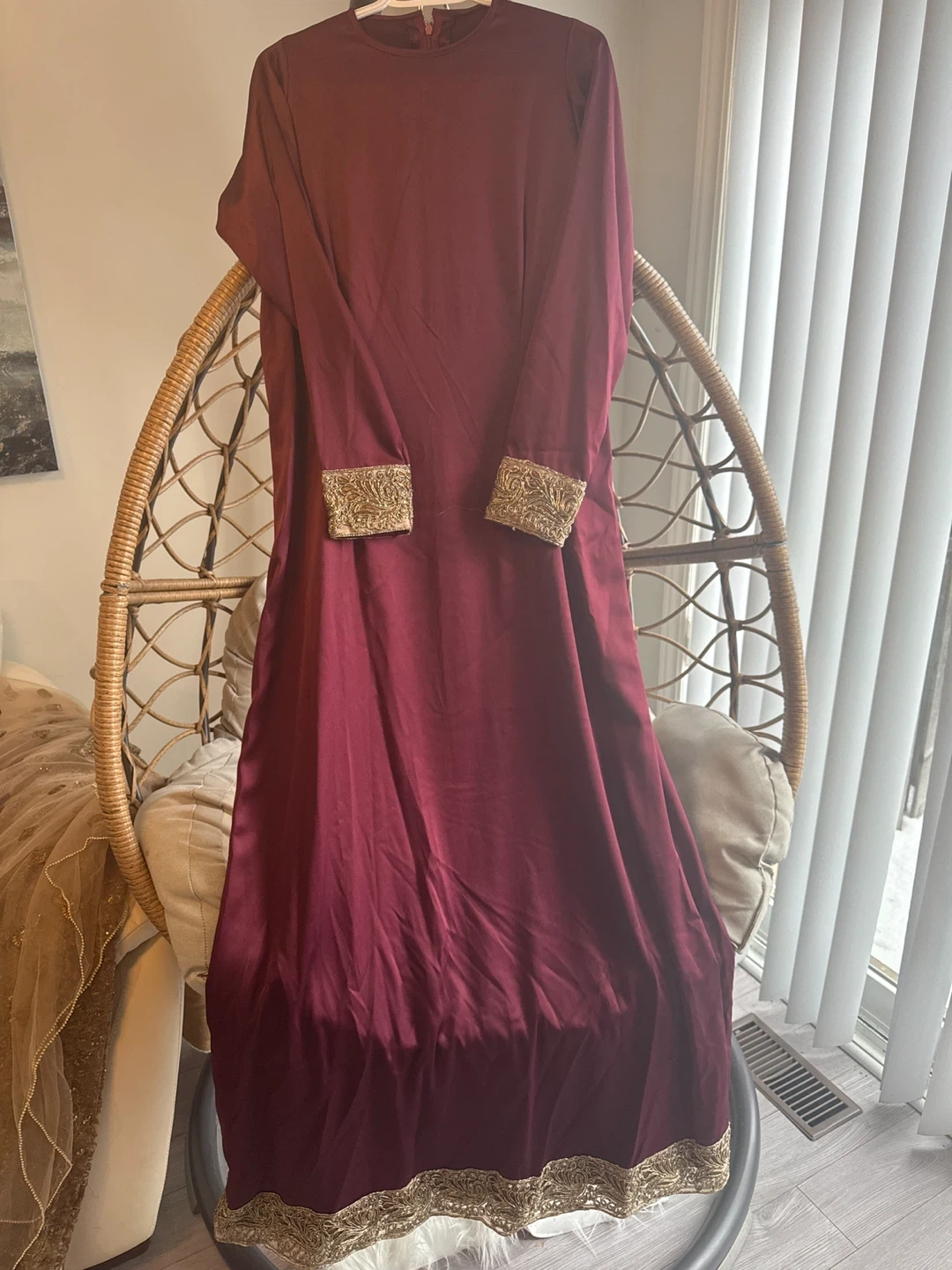 Beautiful burgundy dress with gold embellishments! The dress features intricate gold detailing on the cuffs and hem. A matching sheer shawl with gold accents is also included. Perfect for a special occasion!