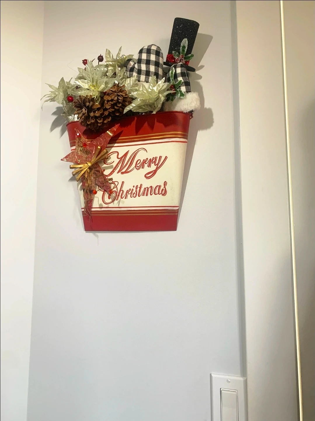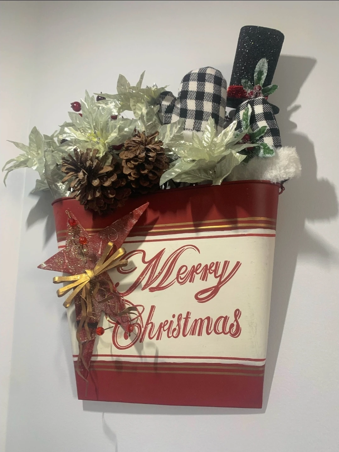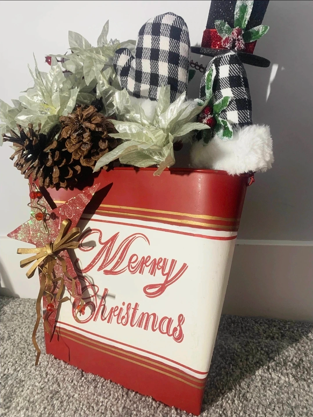 Festive Merry Christmas bucket, perfect for adding a touch of holiday cheer to your home! It comes complete with decorations, including pinecones, and poinsettias. It's in great condition and ready to brighten up any space this season