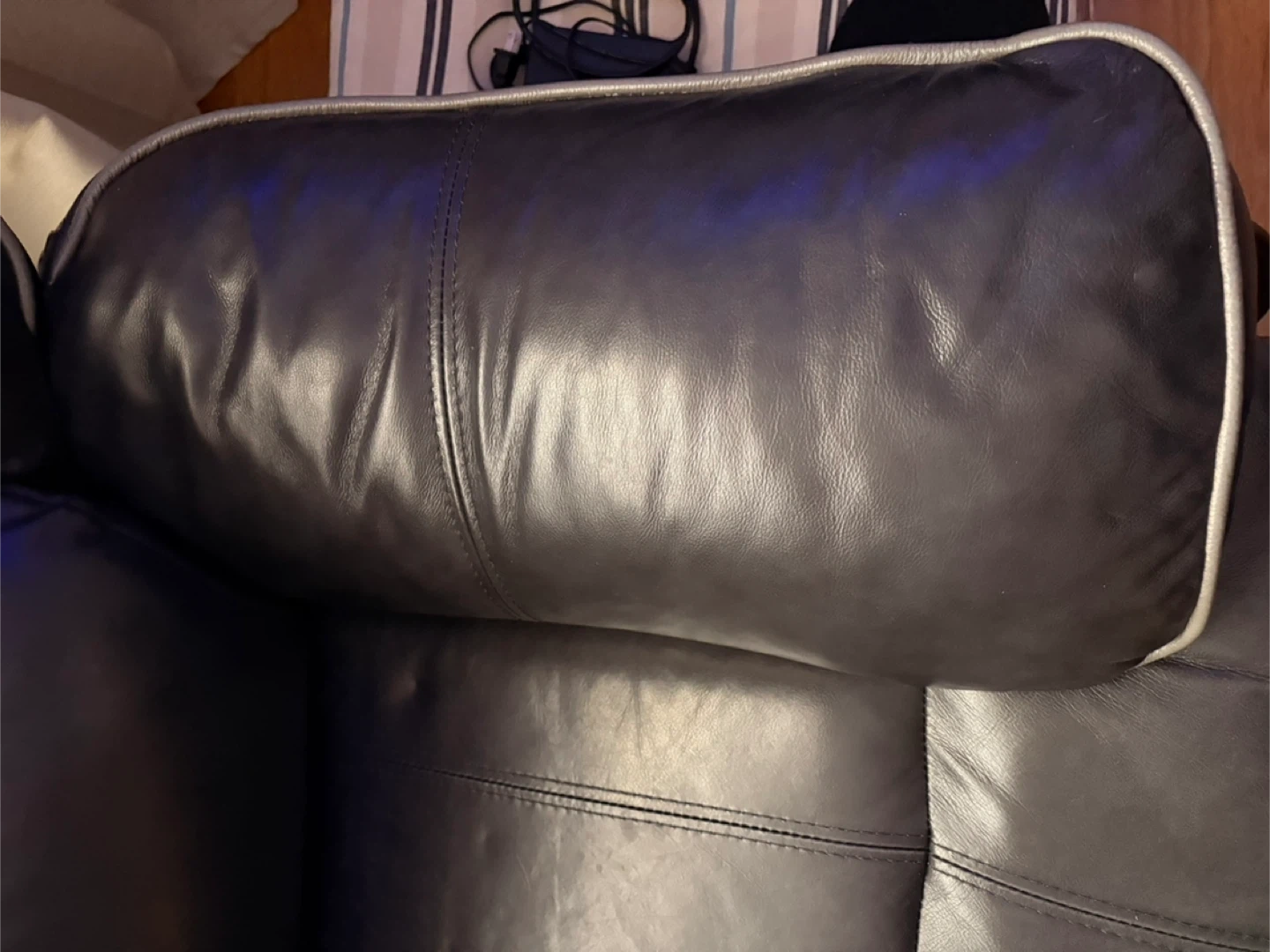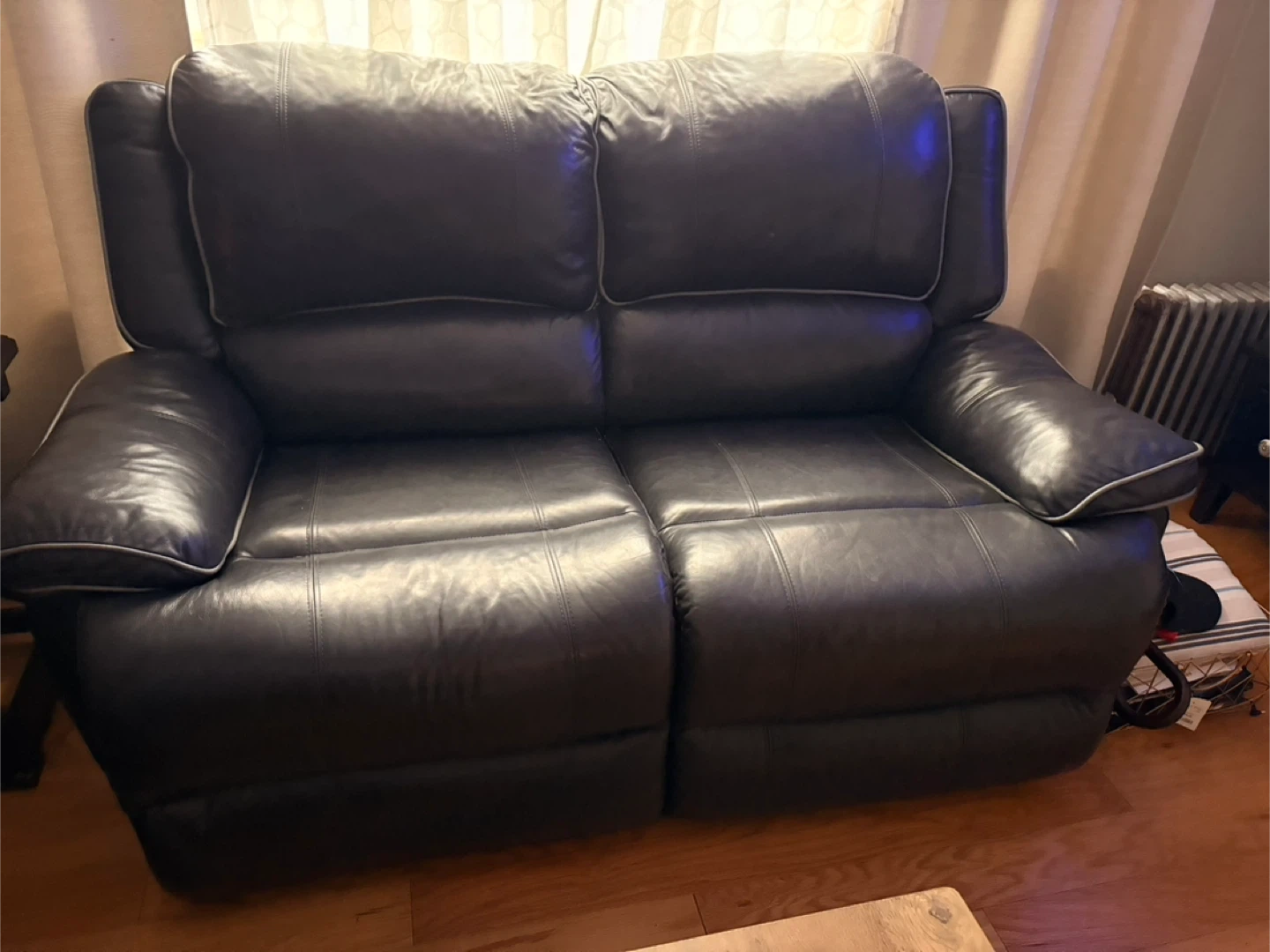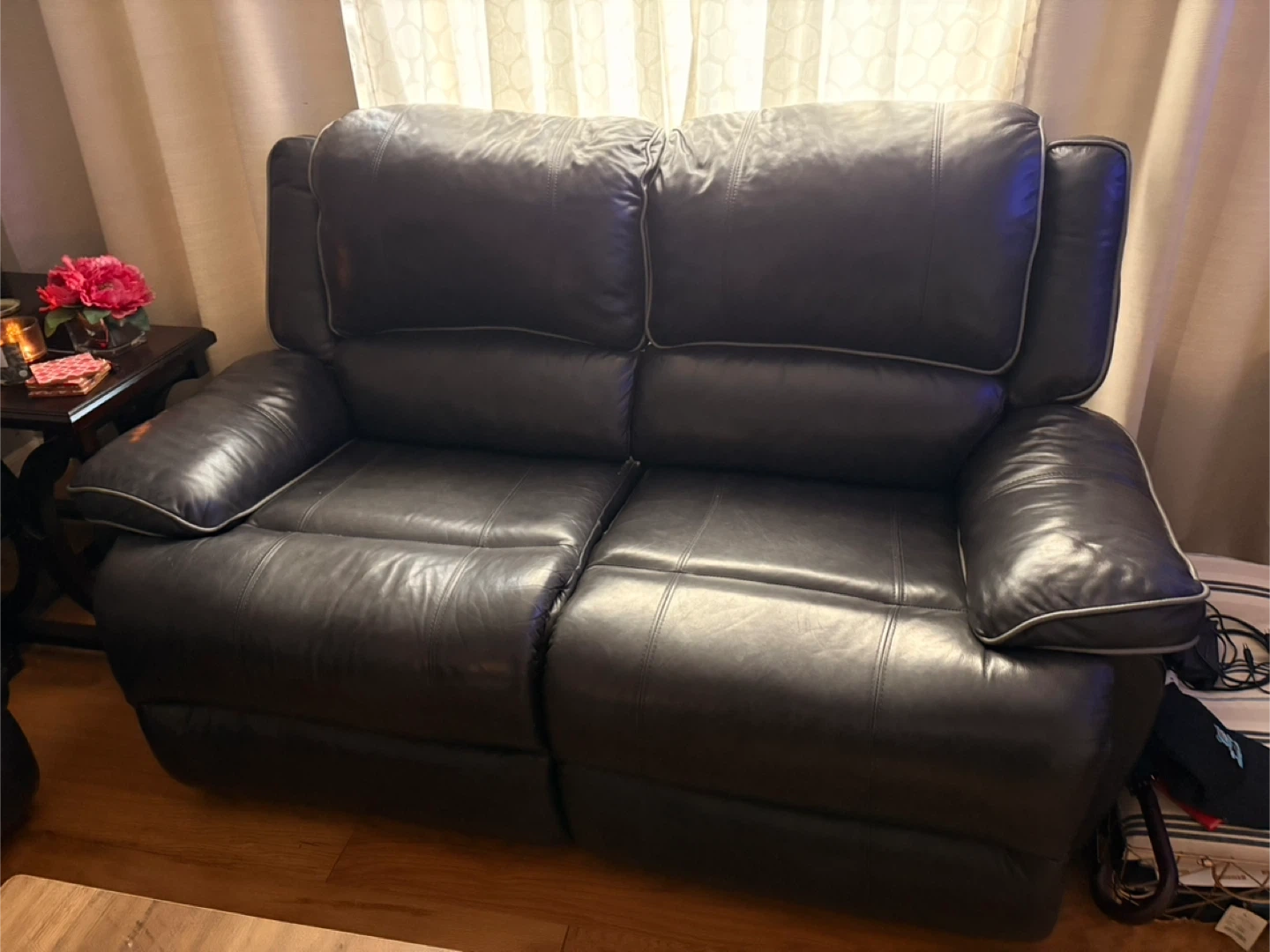 Selling a leather loveseat recliner in great condition! It's a comfy and stylish addition to any living room. The recliner function works perfectly, making it ideal for relaxing after a long day. It's a dark color, so it fits in with any style!
