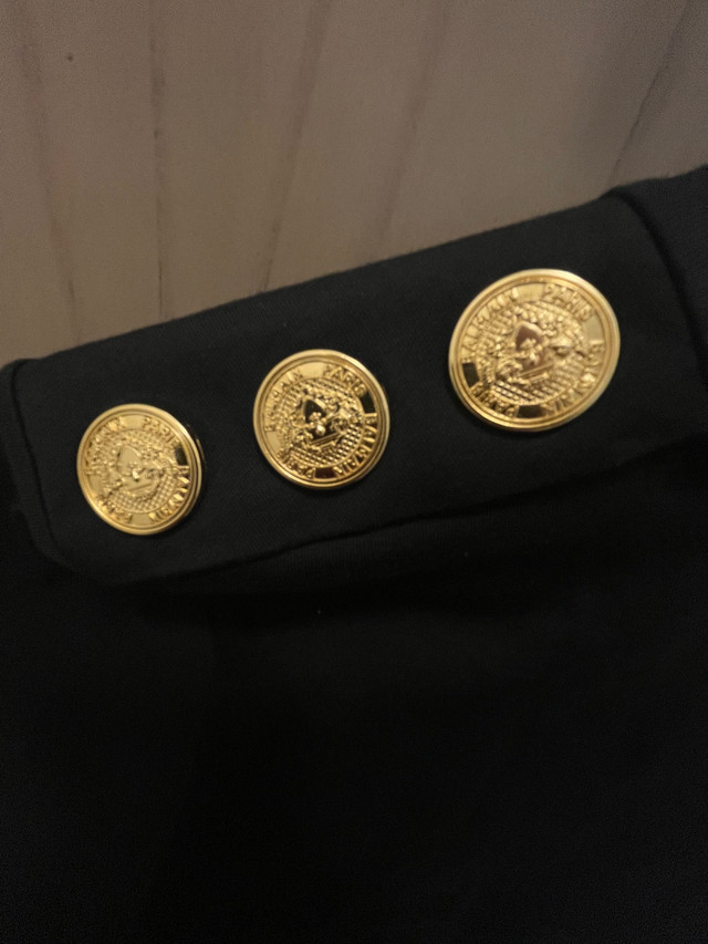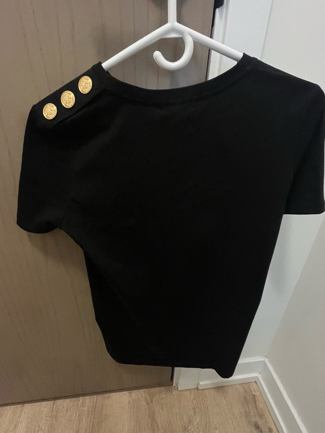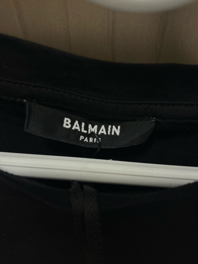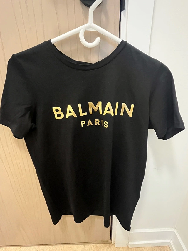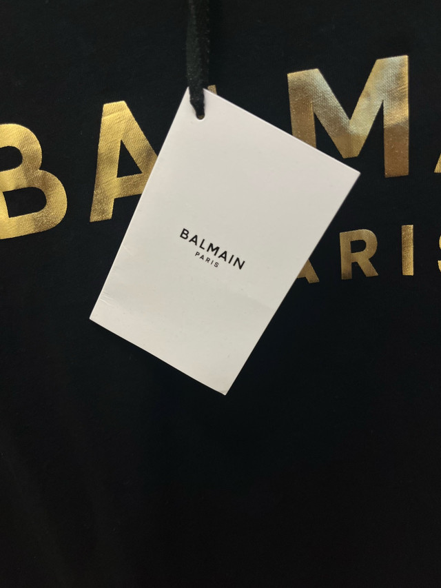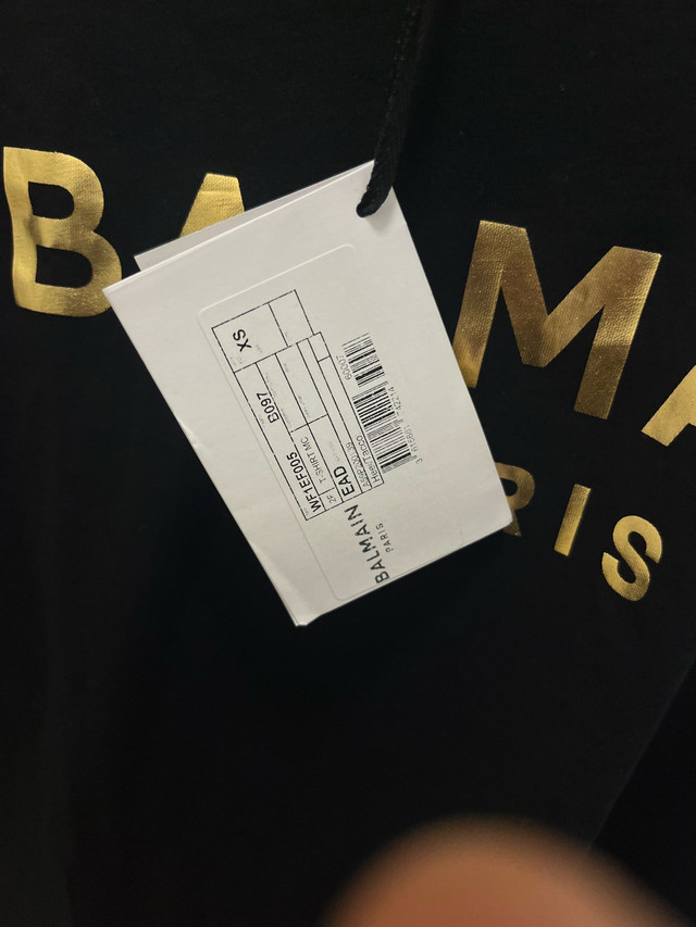 Retail: $695+ CAD Asking: $375 CAD ✅ Brand new with original tags ✅ Jet black cotton with metallic gold “BALMAIN PARIS” front print ✅ Iconic gold lionhead buttons on the left shoulder ✅ Women’s Size XS – slim, tailored fit ✅ 100% authentic — same model sold on SSENSE, Farfetch & Balmain.com Pickup In Toronto or can meet locally within reason.