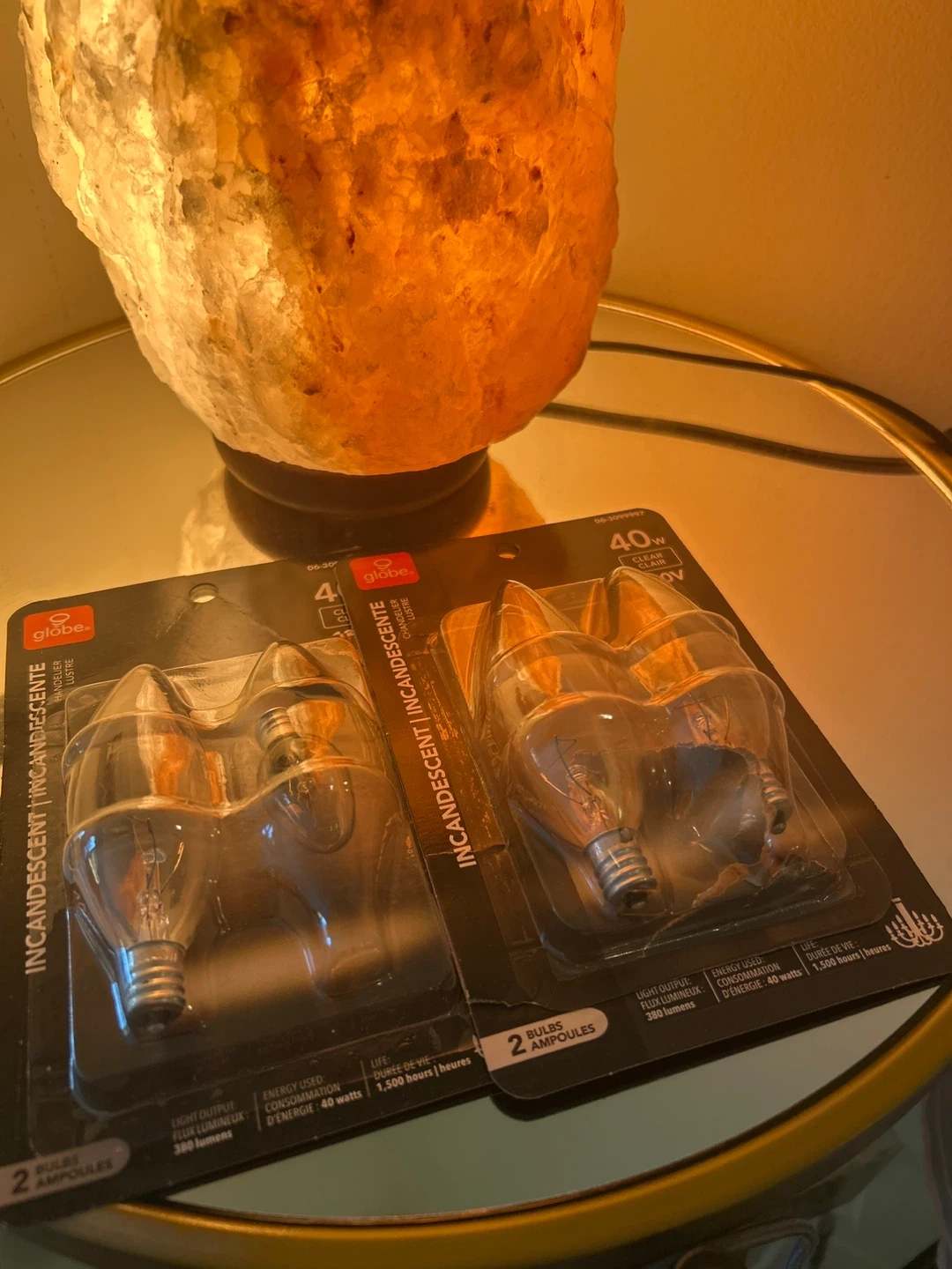Selling a beautiful huge 12” x 8” Himalayan salt lamp! It creates a warm and relaxing atmosphere in any room. Also including two packs of extra incandescent bulbs, each containing two 40-watt bulbs. Perfect for adding a cozy glow to your space.
